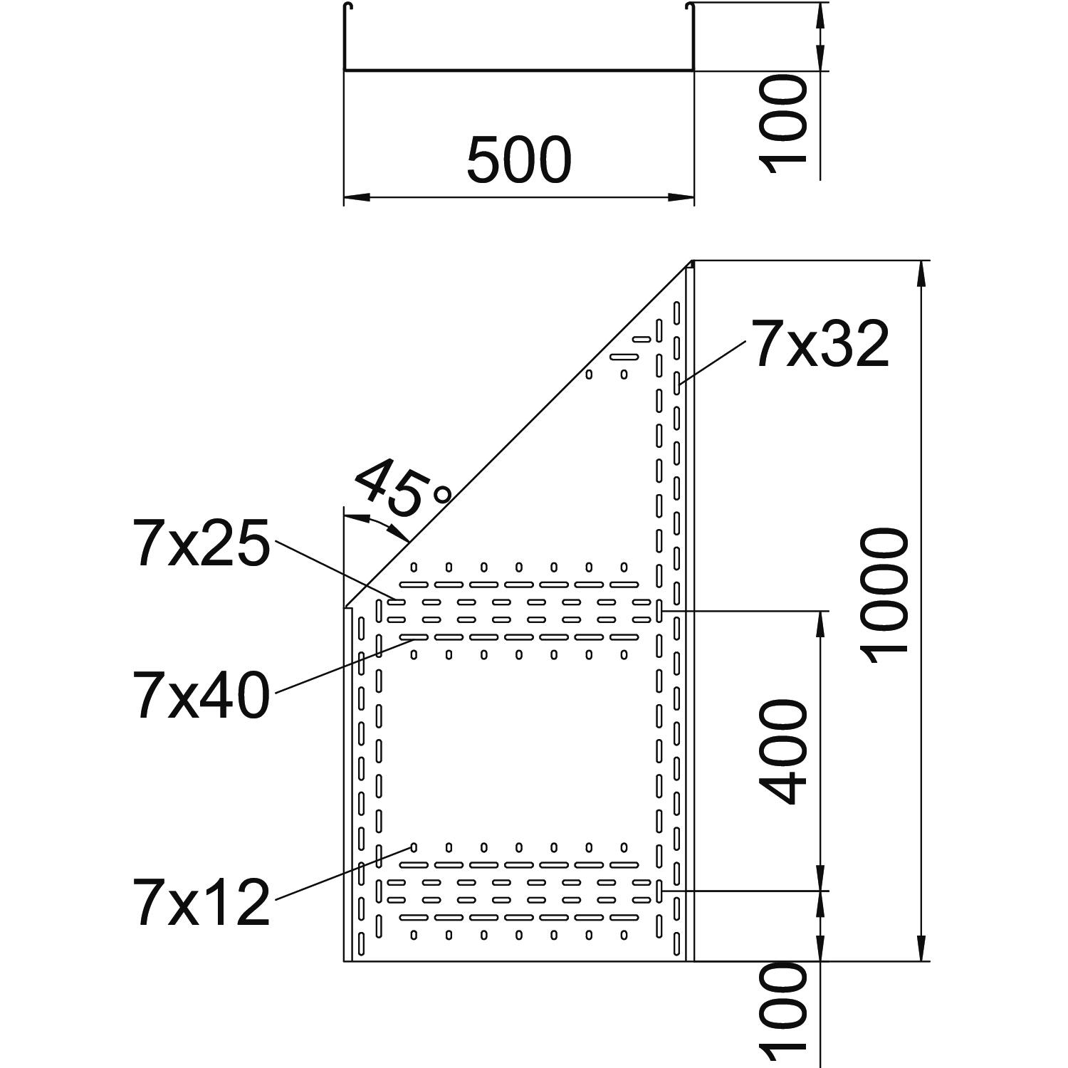 Bend (angle) 45° Change of direction Horizontal CO2 Footprint (GWP) Cradle-to-Gate 39,5022 kg CO2e / 1 Piece Colour zinc Connector version Without connectors Dimension 100x500x1000 Dimension B 500 mm Dimension H 100 mm Dimension L 1000 mm Height 100 mm Length 1000 mm Maintain electrical functions no Material Steel Mounting perforation in base yes NATO hole pattern no Permitted temperature range, max. 120 °C Permitted temperature range, min. -20 °C Plate thickness 2 mm Rustproof steel, pickled no Side perforation yes Surface Strip galvanized Type Bend, rigid Type of connector, cable support system Screwed Wide-span version no Width 500 mm - All types