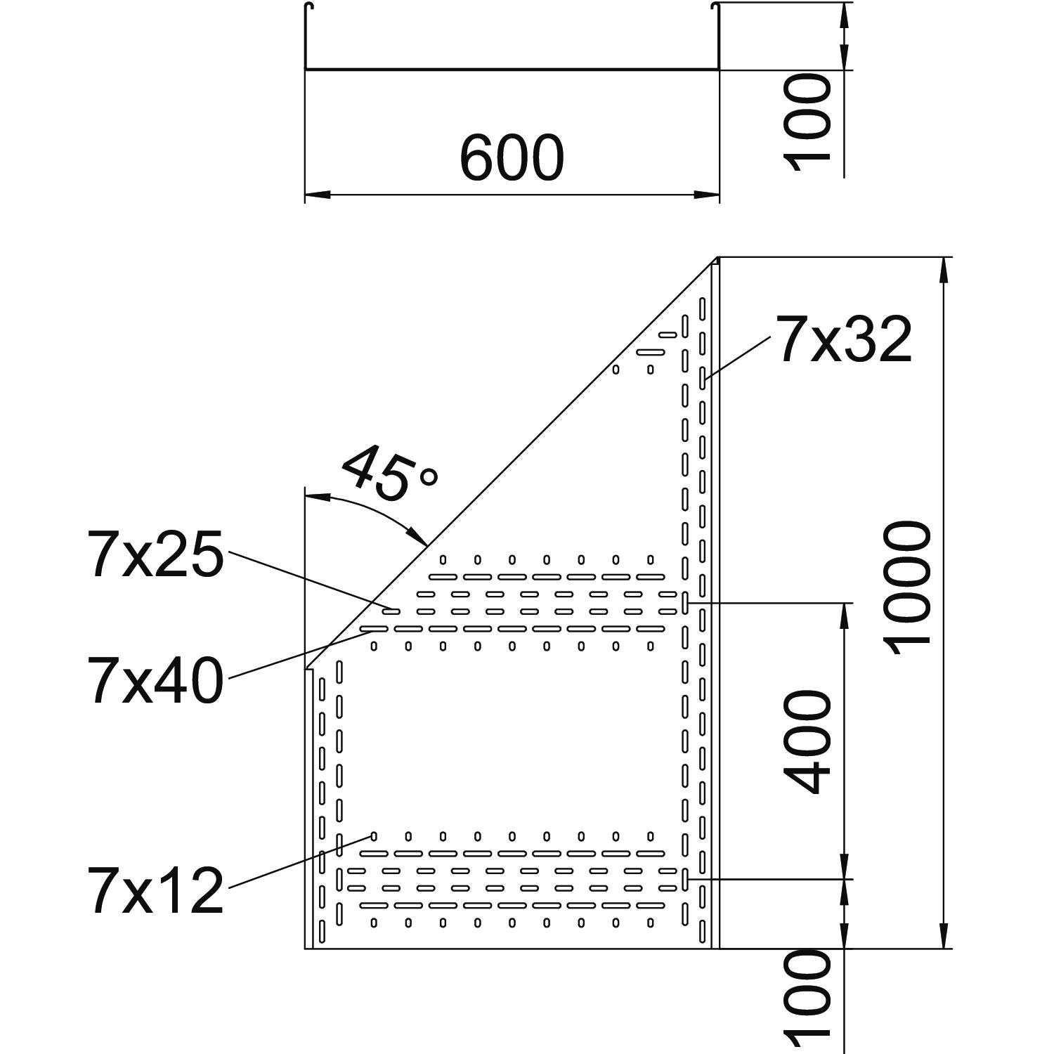 Bend (angle) 45° Change of direction Horizontal CO2 Footprint (GWP) Cradle-to-Gate 26,3348 kg CO2e / 1 Piece Colour zinc Connector version Without connectors Dimension 100x600x1000 Dimension B 600 mm Dimension H 100 mm Dimension L 1000 mm Height 100 mm Length 1000 mm Maintain electrical functions no Material Steel Mounting perforation in base yes NATO hole pattern no Permitted temperature range, max. 120 °C Permitted temperature range, min. -20 °C Plate thickness 2 mm Rustproof steel, pickled no Side perforation yes Surface Strip galvanized Type Bend, rigid Type of connector, cable support system Screwed Wide-span version no Width 600 mm - All types