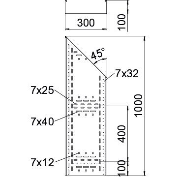 Bend (angle) 45° Change of direction Horizontal CO2 Footprint (GWP) Cradle-to-Gate 26,5366 kg CO2e / 1 Piece Colour zinc Connector version Without connectors Dimension 100x300x1000 Dimension B 300 mm Dimension H 100 mm Dimension L 1000 mm Height 100 mm Length 1000 mm Maintain electrical functions no Material Steel Mounting perforation in base yes NATO hole pattern no Permitted temperature range, max. 120 °C Permitted temperature range, min. -20 °C Plate thickness 2 mm Rustproof steel, pickled no Side perforation yes Surface Strip galvanized Type Bend, rigid Type of connector, cable support system Screwed Wide-span version no Width 300 mm - All types
