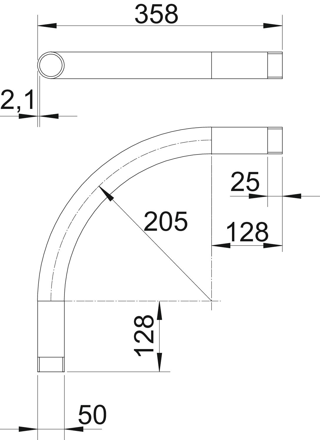 Angle of the bend 90 ° Brushed surface no Dimension M50x1,5 Dimension A 128 mm Dimension B 358 mm Dimension D 50 mm Dimension l 25 mm Dimension m (mm) M50 Dimension R 205 mm Dimension t 2,1 mm Flexible no For nominal pipe diameter 50 mm Halogen-free no Material Aluminium Permitted temperature range, max. 250 °C Permitted temperature range, min. -45 °C Polished surface no Thread M50x1,5 Two-part no Version for Thread With inspection opening and lid no With sleeve yes - All types