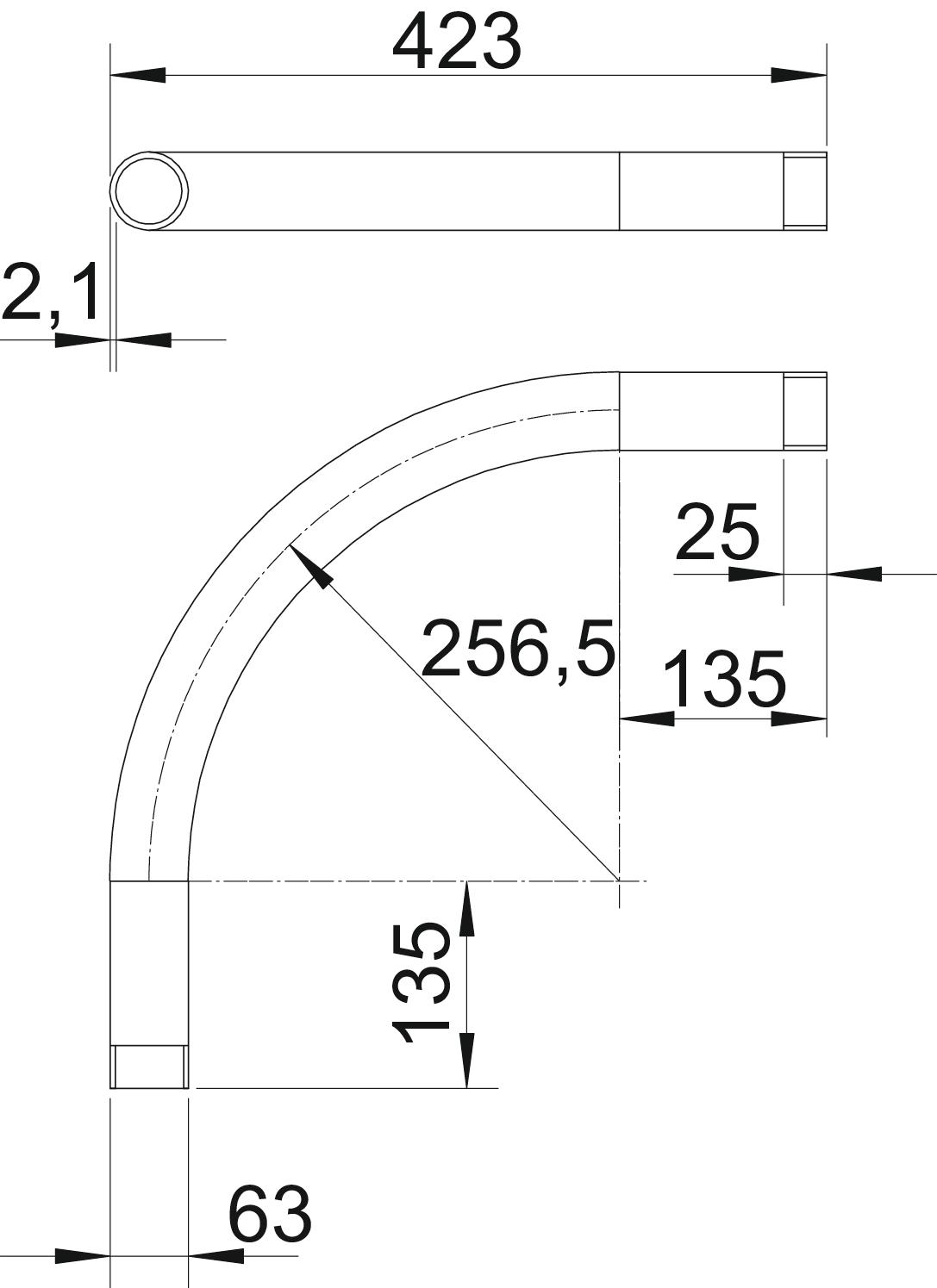 Angle of the bend 90 ° Brushed surface no Dimension M63x1,5 Dimension A 135 mm Dimension B 423 mm Dimension D 63 mm Dimension l 25 mm Dimension m (mm) M63 Dimension R 256,5 mm Dimension t 2,1 mm Flexible no For nominal pipe diameter 63 mm Halogen-free no Material Aluminium Permitted temperature range, max. 250 °C Permitted temperature range, min. -45 °C Polished surface no Thread M63x1,5 Two-part no Version for Thread With inspection opening and lid no With sleeve yes - All types