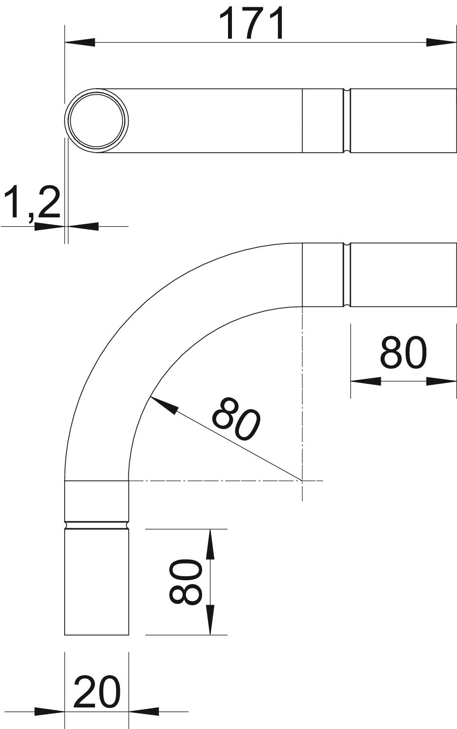 Angle of the bend 90 ° Brushed surface no Dimension Ø20mm Dimension A 80 mm Dimension B 171 mm Dimension D 20,2 mm Dimension l 30 mm Dimension m (mm) M20 Dimension R 70 mm Dimension t 1,2 mm Flexible no For nominal pipe diameter 20 mm Halogen-free no Material Aluminium Permitted temperature range, max. 250 °C Permitted temperature range, min. -45 °C Polished surface no Two-part no Version for Connector With inspection opening and lid no With sleeve yes - All types