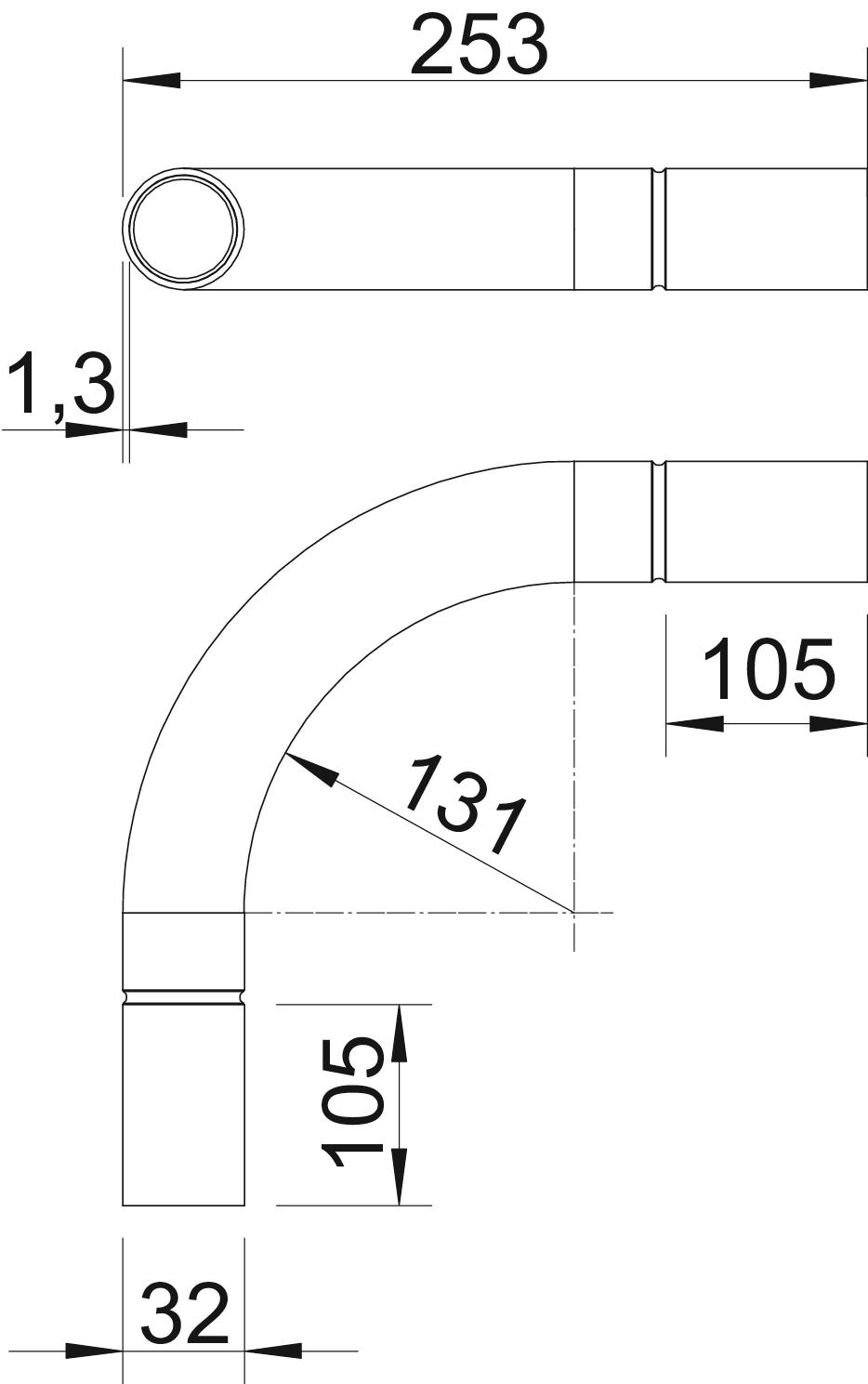 Angle of the bend 90 ° Brushed surface no Dimension Ø32mm Dimension A 105 mm Dimension B 253 mm Dimension D 32,2 mm Dimension l 40 mm Dimension m (mm) M32 Dimension R 115 mm Dimension t 1,3 mm Flexible no For nominal pipe diameter 32 mm Halogen-free no Material Aluminium Permitted temperature range, max. 250 °C Permitted temperature range, min. -45 °C Polished surface no Two-part no Version for Connector With inspection opening and lid no With sleeve yes - All types