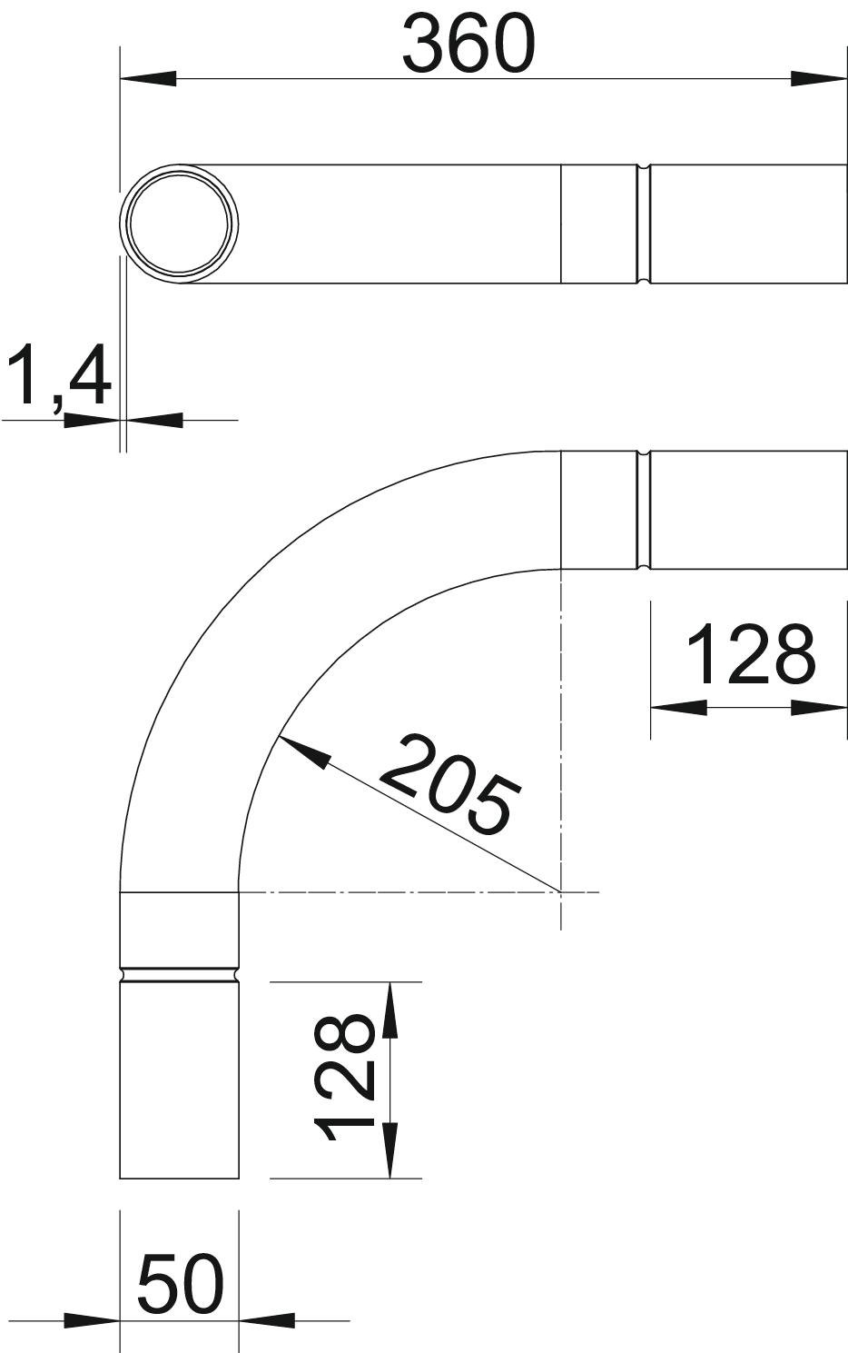 Angle of the bend 90 ° Brushed surface no Dimension Ø50mm Dimension A 128 mm Dimension B 360 mm Dimension D 50 mm Dimension l 63 mm Dimension m (mm) M50 Dimension R 180 mm Dimension t 1,4 mm Flexible no For nominal pipe diameter 50 mm Halogen-free no Material Aluminium Permitted temperature range, max. 250 °C Permitted temperature range, min. -45 °C Polished surface no Two-part no Version for Connector With inspection opening and lid no With sleeve yes - All types