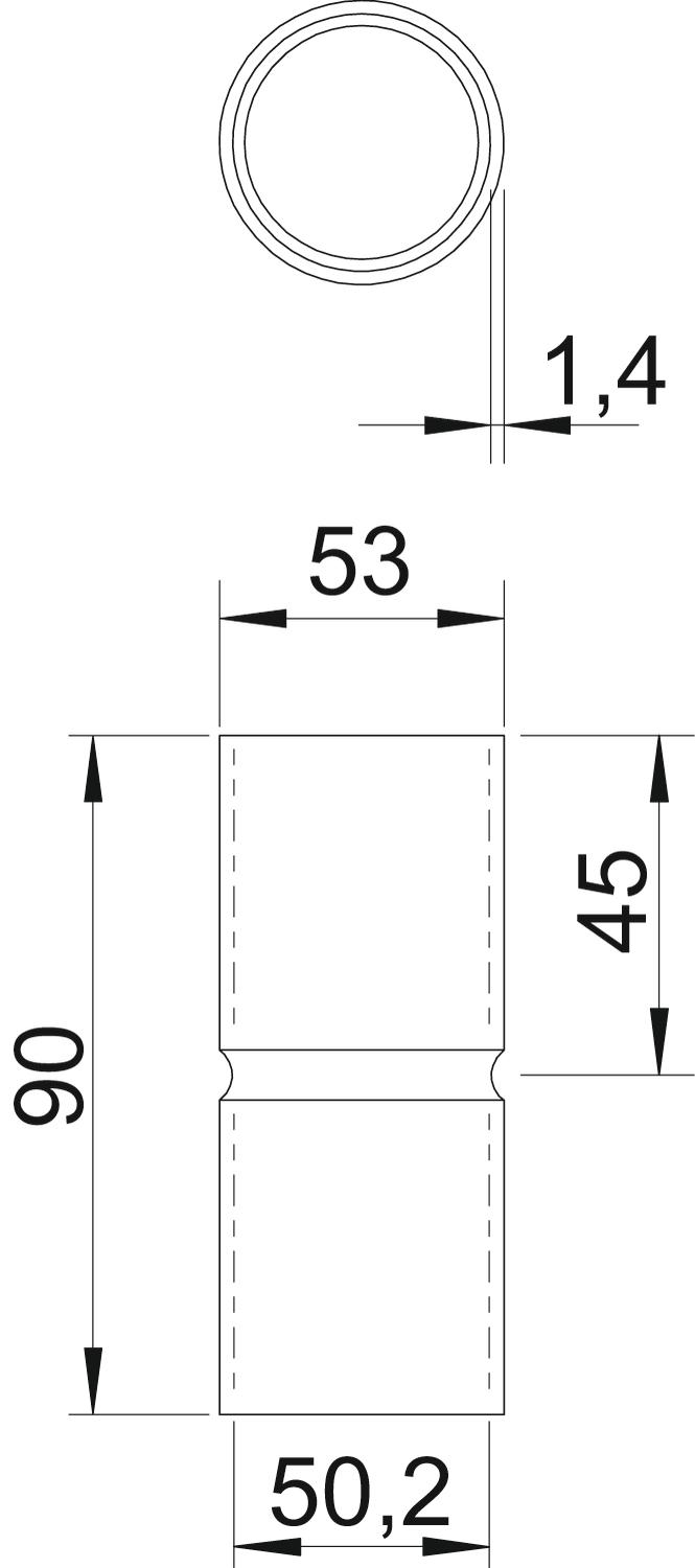 Brushed surface no Dimension Ø50mm Dimension d 50,2 mm Dimension D 53 mm Dimension L 90 mm Dimension l 45 mm Dimension t 1,4 mm for pipe diameter 50 mm Halogen-free yes Length 90 mm Material Aluminium Permitted temperature range, max. 250 °C Permitted temperature range, min. -45 °C Polished surface no Size 50 Two-part no Version for Connector With inspection opening and lid no - All types