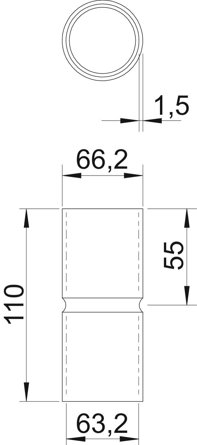Brushed surface no Dimension Ø63mm Dimension D 66,2 mm Dimension d 63,2 mm Dimension l 55 mm Dimension L 110 mm Dimension t 1,5 mm for pipe diameter 63 mm Halogen-free yes Length 110 mm Material Aluminium Permitted temperature range, max. 250 °C Permitted temperature range, min. -45 °C Polished surface no Size 63 Two-part no Version for Connector With inspection opening and lid no - All types