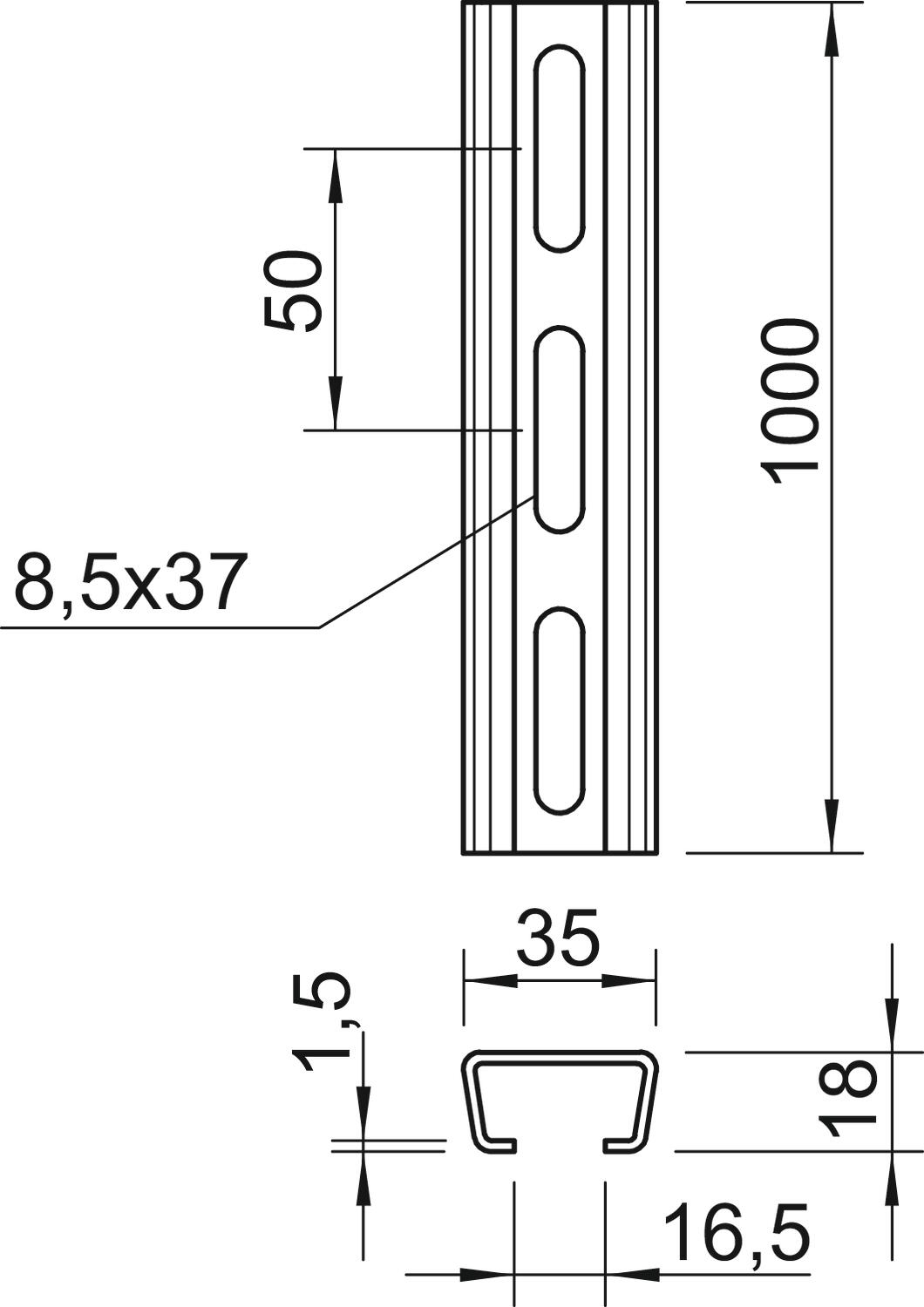 Breakable no CO2 Footprint (GWP) Cradle-to-Gate 2,002 kg CO2e / 1 Meter Dimension 1000x35x18 Dimension L 1000 mm Drill hole spacing, centre 50 mm Height 18 mm Length 1000 mm Maintain electrical functions yes Material Steel Material thickness 1,5 mm Profile shape C profile Slot width 16,5 mm Static value A 1,01 cm² Static value ly 0,44 cm⁴ Static value lz 1,84 cm⁴ Static value Wy 0,42 cm³ Static value Wz 1,05 cm³ Surface Strip galvanized Type of perforation Perforated back Version for Single profile Width 35 mm With perforation yes With toothing no - All types