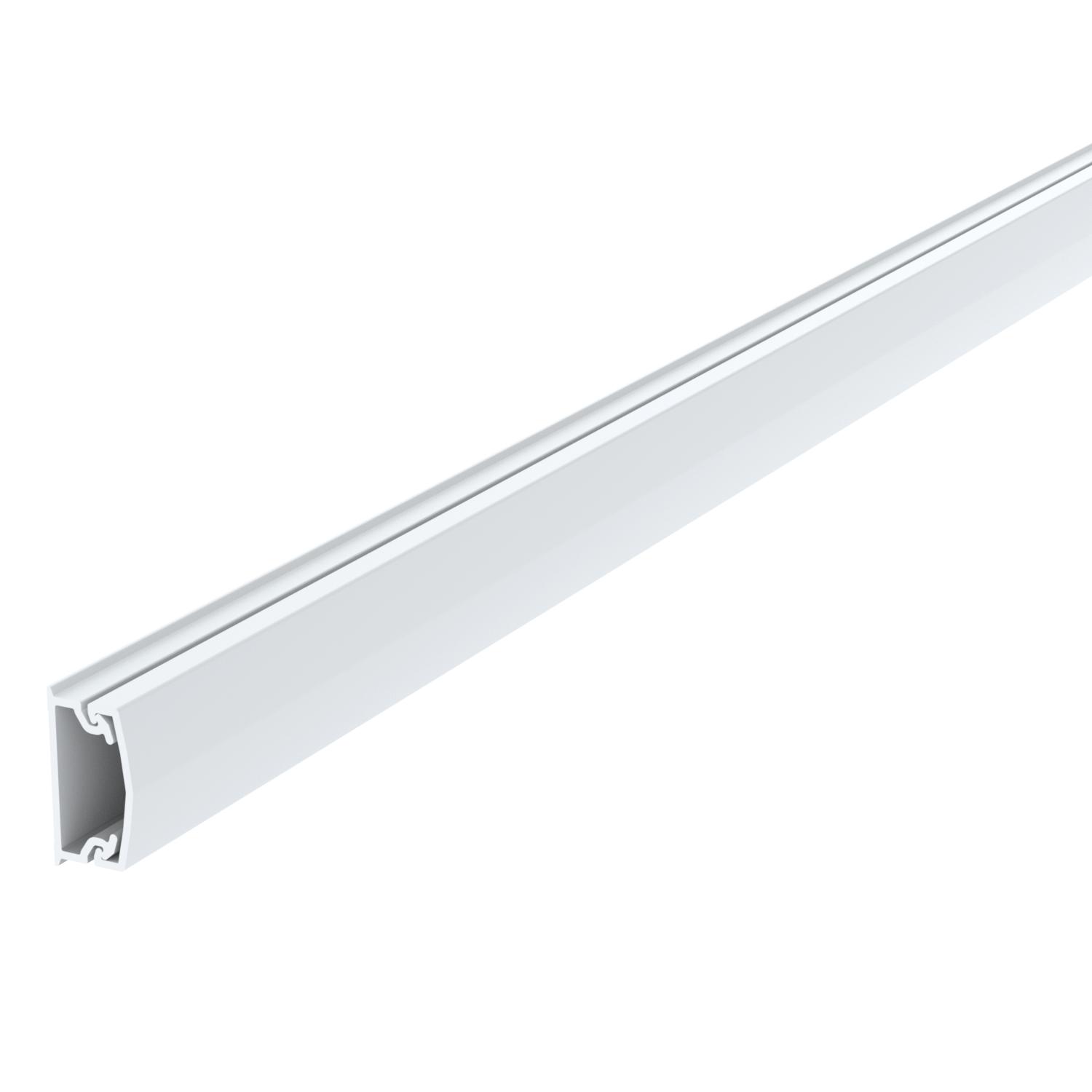 Trunking base with adhesive tape for direct mounting on the wall. With patented surface with HDF sealing for considerably reduced sensitivity to scratches. Cover designed in the shape of a sloping roof.