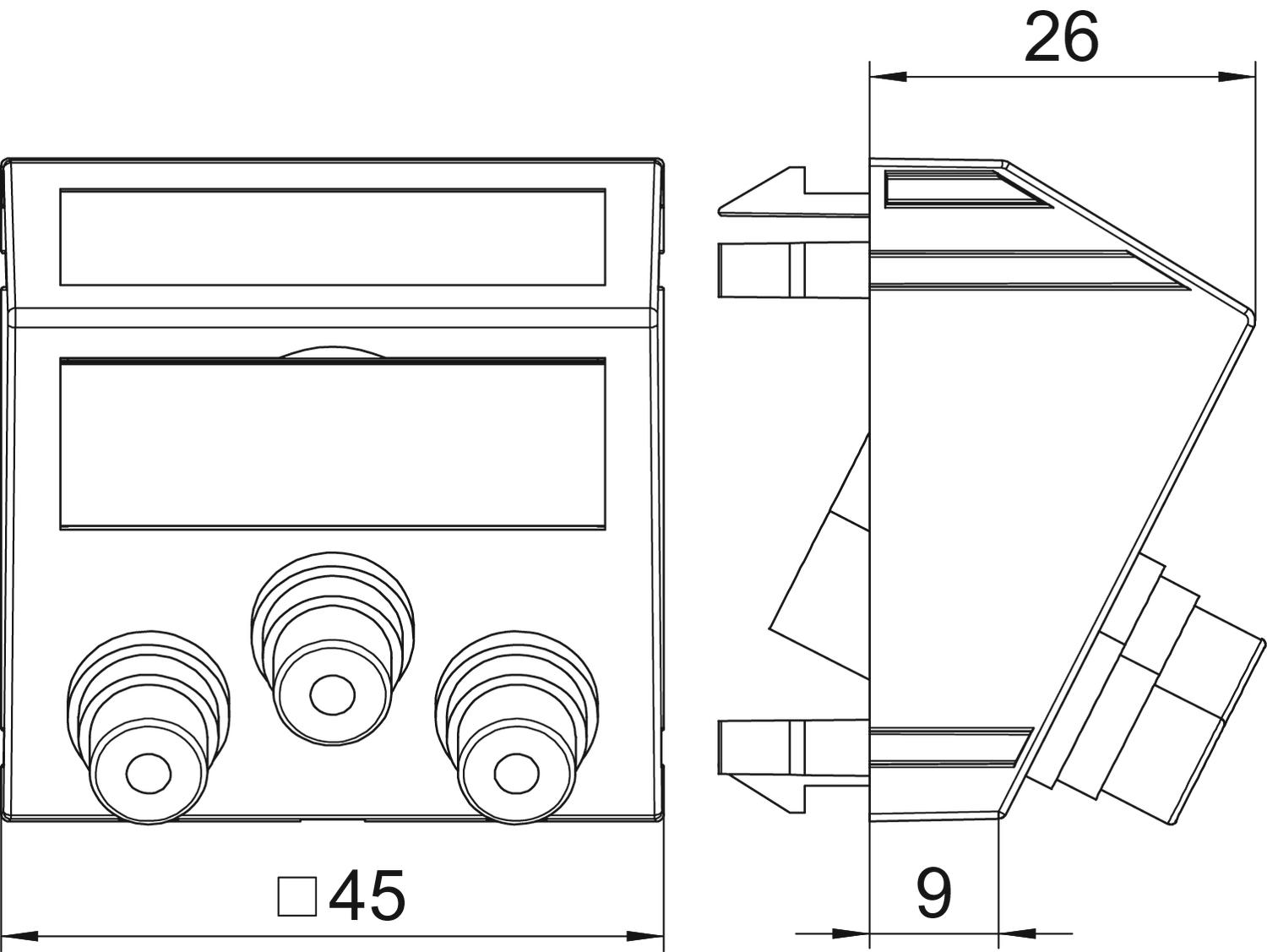 Product descriptionMultimedia support with three cinch connection sockets for audio/video, slanting cable outlet, with labelling panel, three cinch couplings (RCA), socket-socket version, colour coding yellow/red/white. Support plate with locking fastening, suitable for horizontal and vertical installation in the system environment.