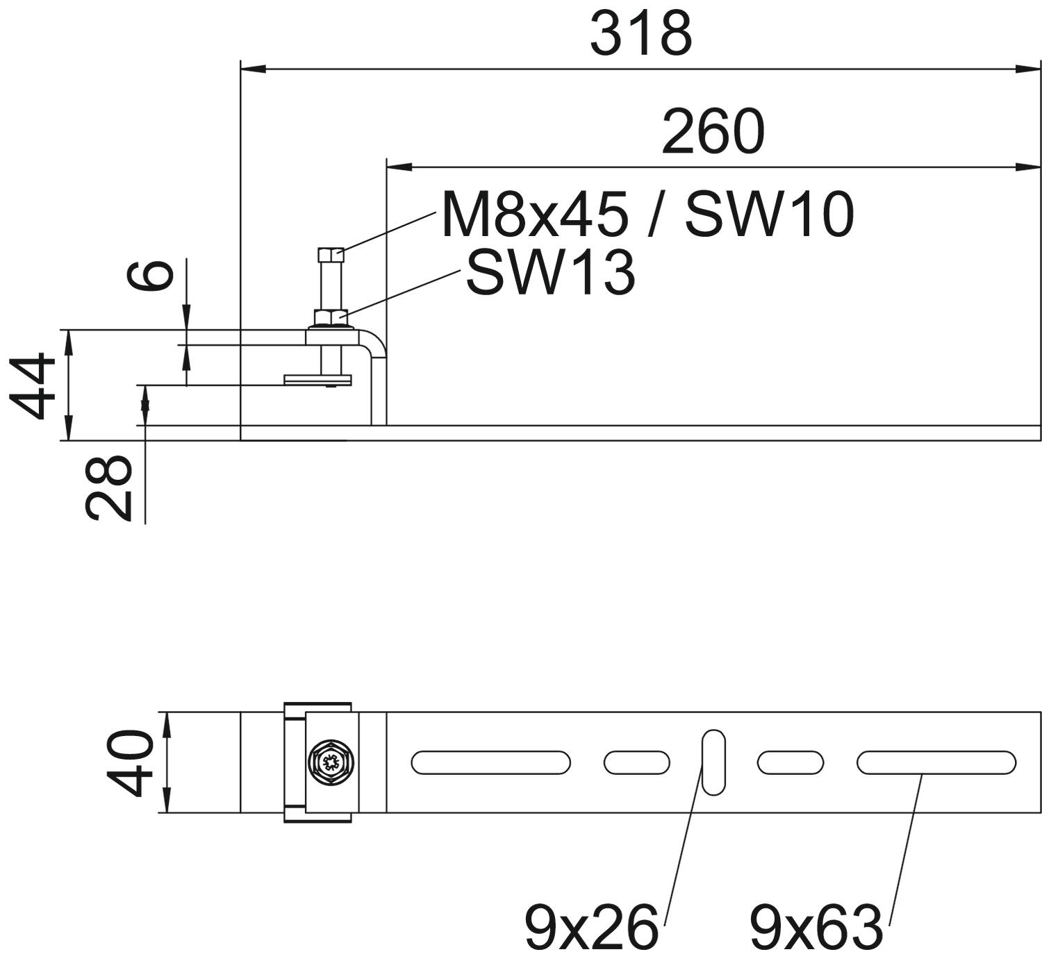 Colour zinc Dimension 318x44x40 Height 32 mm Length 318 mm Material Steel Material thickness 6 mm Permitted temperature range, max. 120 °C Permitted temperature range, min. -20 °C Rustproof steel, pickled no Surface Hot-dip galvanised Width 260 mm - All types