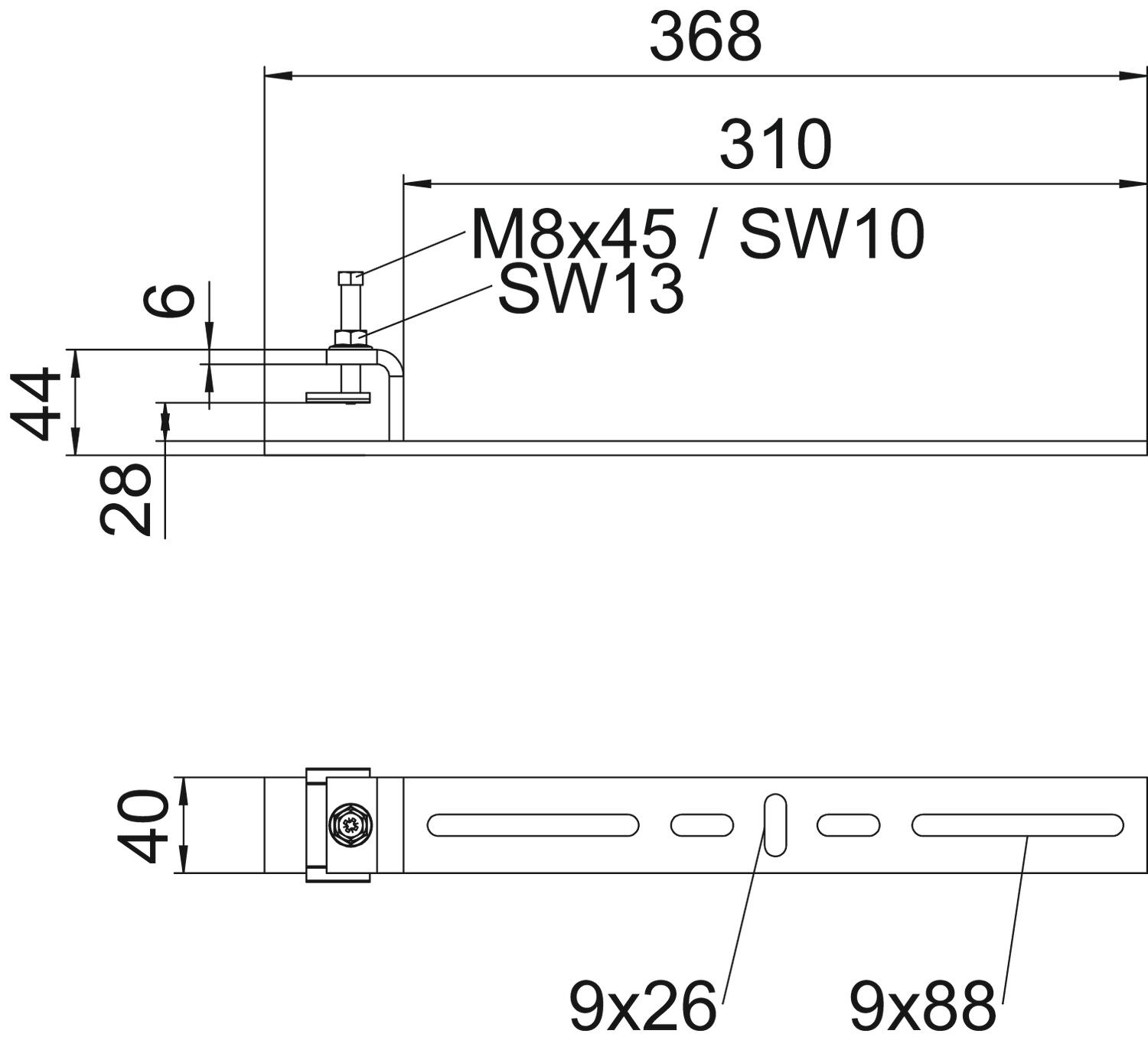 Colour zinc Dimension 368x44x40 Height 32 mm Length 368 mm Material Steel Material thickness 6 mm Permitted temperature range, max. 120 °C Permitted temperature range, min. -20 °C Rustproof steel, pickled no Surface Hot-dip galvanised Width 310 mm - All types