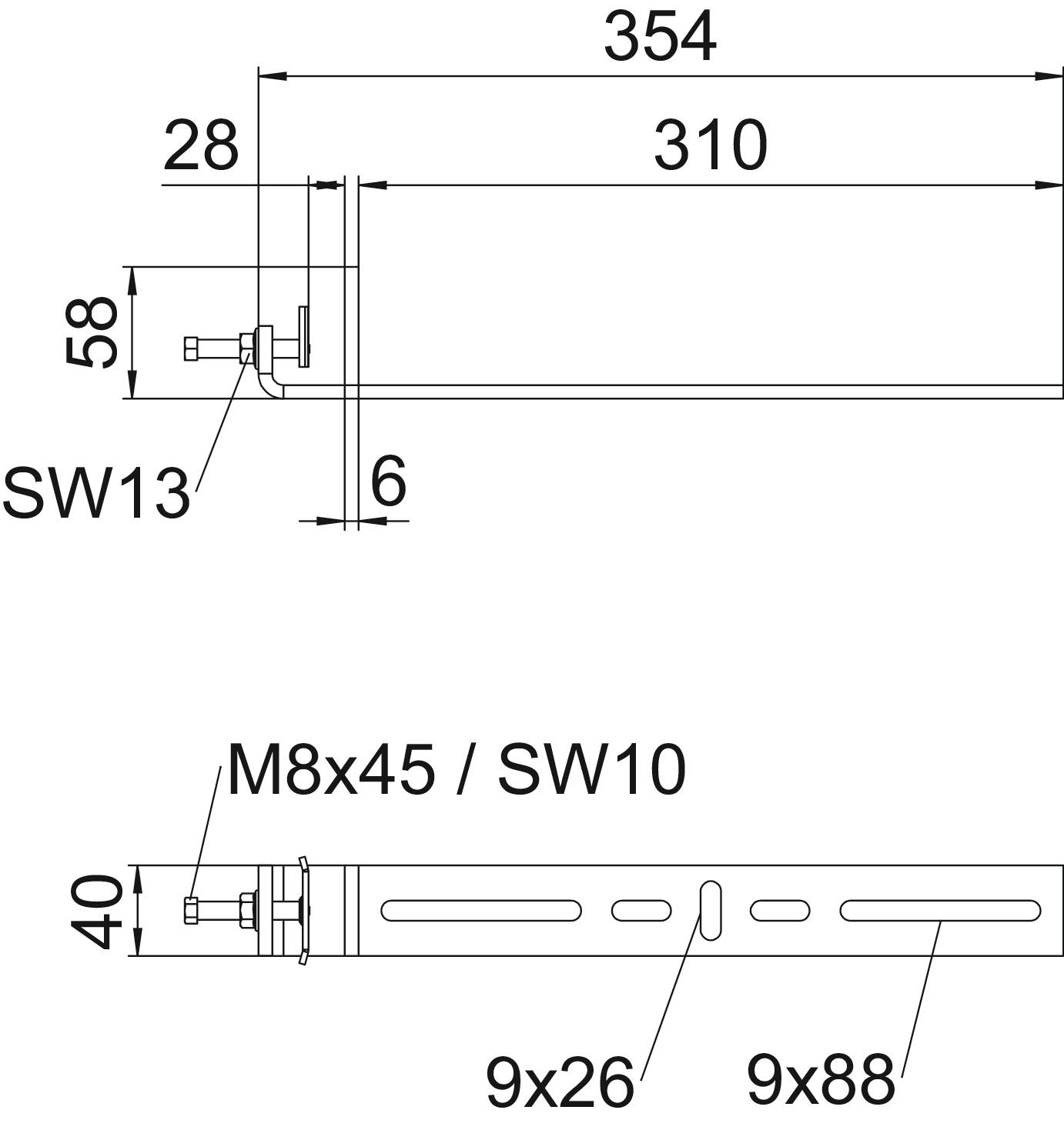 Colour zinc Dimension 354x58x40 Height 58 mm Length 348 mm Material Steel Material thickness 6 mm Permitted temperature range, max. 120 °C Permitted temperature range, min. -20 °C Rustproof steel, pickled no Surface Hot-dip galvanised Width 310 mm - All types