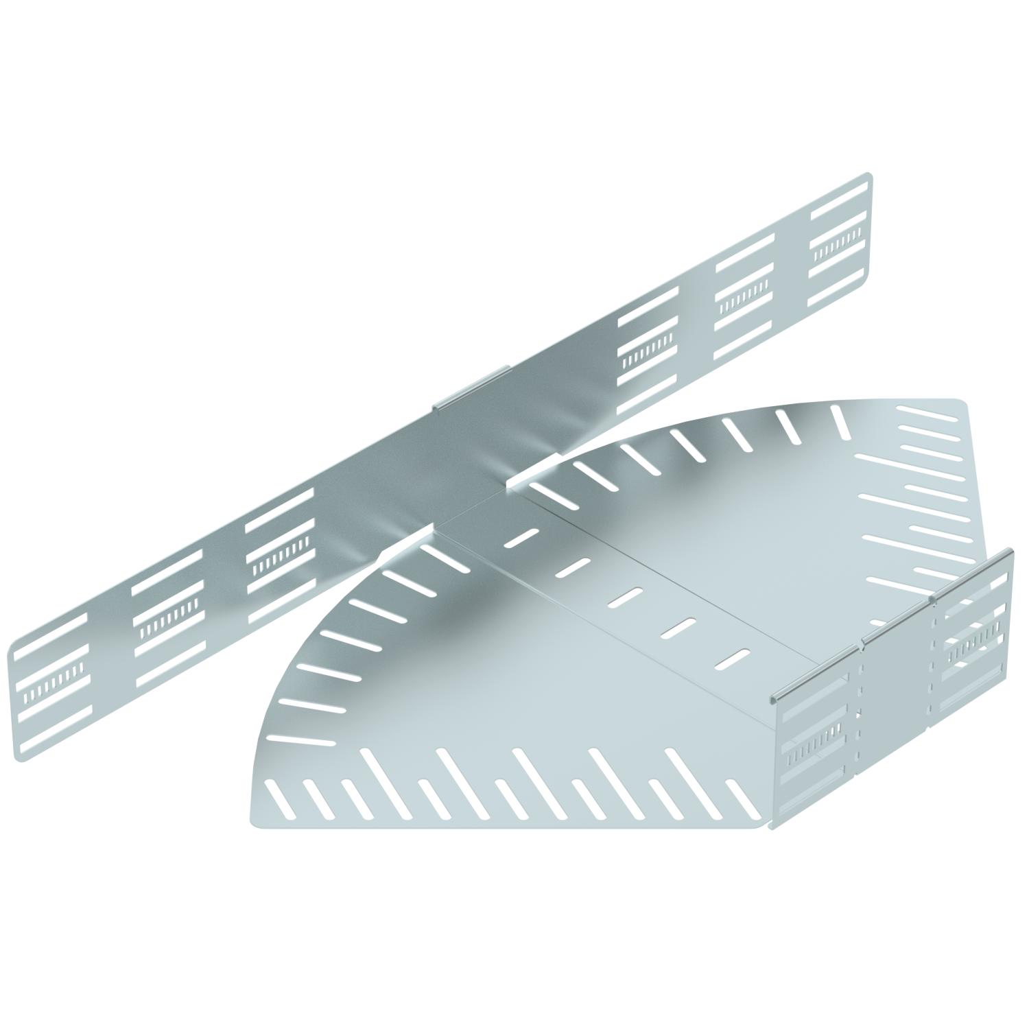 Product descriptionAngle-adjustable bend for the creation of a horizontal branch, fitting for lock and screw-on cable trays of side height 110 mm. Adjustable angle 0–90°. Screwless mounting with double clamps or screw connection with FRS truss-head screws and M6 combination nuts. Can be used in indoor areas. Fastening material must be ordered separately.