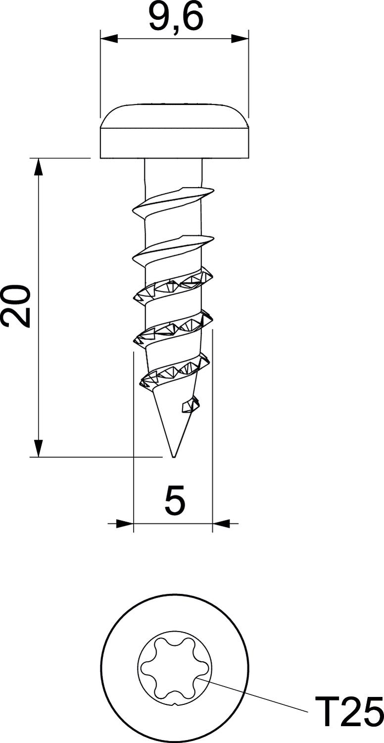 Colour zinc Dimension 5x20 Dimension d 5 mm Dimension D 9,6 mm Dimension L 20 mm Head shape Miscellaneous Length 20 mm Material Steel Screw system Torx Surface Electrogalvanized, transparently passivated Thread diameter ST 5 - All types
