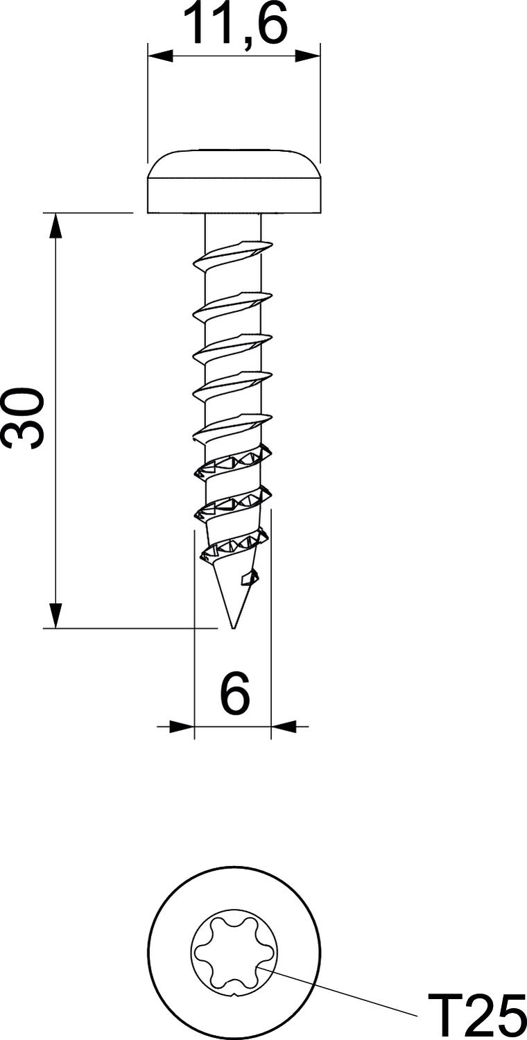 Colour zinc Dimension 6x30 Dimension D 11,6 mm Dimension d 6 mm Dimension L 30 mm Head shape Miscellaneous Material Steel Screw system Torx Surface Electrogalvanized, transparently passivated Thread diameter ST 6 - All types