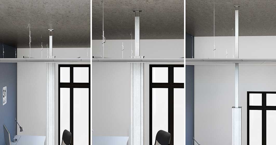 An extendable telescope provides a clamping range of 3015–4,500 mm. Cables can be inserted both through the telescopic square pipe and directly into the main profile from below or above.