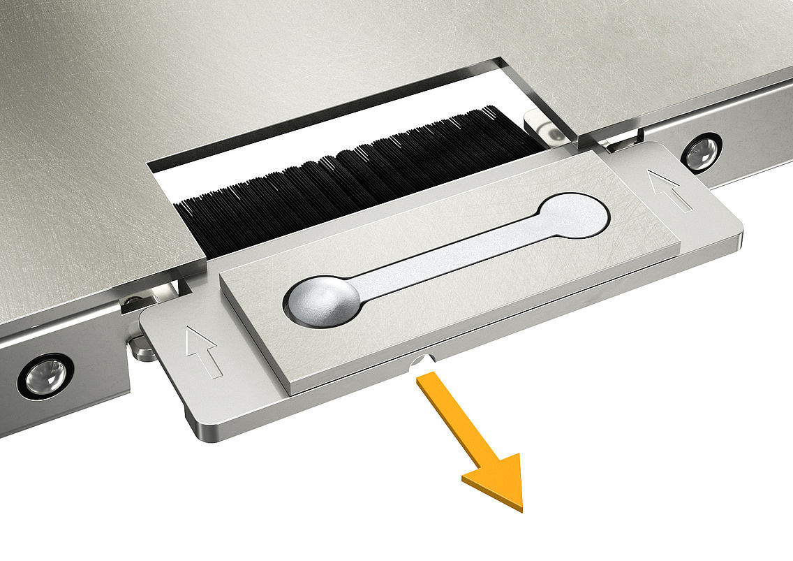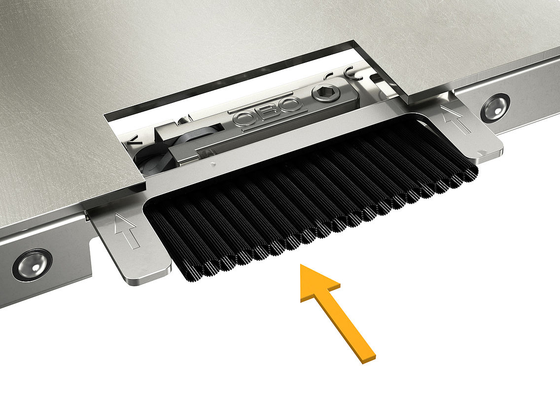 In the used state, the cables are run discreetly over the bar without an edge. The patented brush bar offers a clear, discreet design, which, thanks to the flat opening lever, blends into existing interiors flexibly and harmoniously. This guarantees a safe electrical installation, which also can meet high aesthetic requirements.