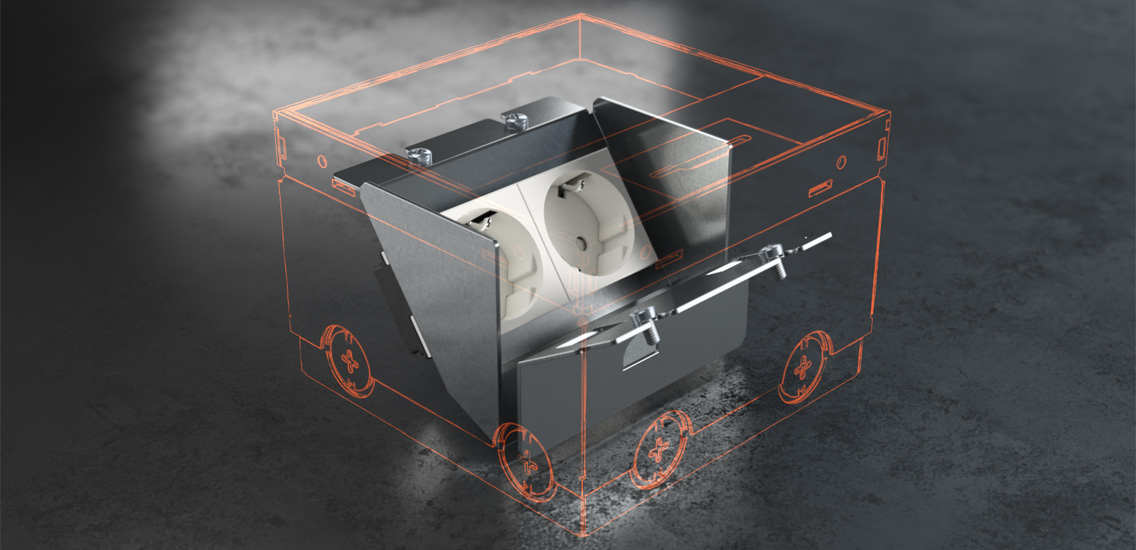 The UDHOME2 offers a lot space: Even with its small external dimensions, it is extremely spacious. This is achieved by the interior space, which is slanted at an angle of 54 degrees. This means that there is also sufficient space for larger connectors and smaller charging units, which disappear under the closed cover. With its slender cover edges, the UDHOME2 integrates itself perfectly into various floors and discreetly blends in with the room.