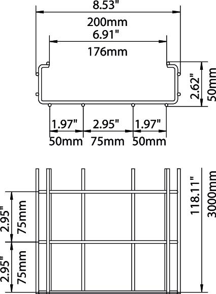 CO2 Footprint (GWP) Cradle-to-Gate 3,75 kg CO2e / 1 Meter Colour zinc Connector version Without connectors Dimension 50x200x3000 Dimension A 176 mm Dimension B 217 mm Dimension H 67 mm Dimension l1 75 mm Dimension L2 (mm) 50 mm Height 50 mm Height 1,97 in Integrated partition Without Length 3000 mm Load test type according to IEC 61537 Type II Maintain electrical functions no Material Steel Profile shape C-shaped Rustproof steel, pickled no Support spacing 1.0 m 1,1 kN/m Support spacing 1.5 m 0,7 kN/m Support spacing 2.0 m 0,4 kN/m Surface Hot-dip galvanised Type of connector, cable support system Screwed Usable cross-section 75 cm² Usable cross-section 7500 mm² Wide-span version no Width 200 mm Width 7,87 in Wire diameter 4,5 mm - All types
