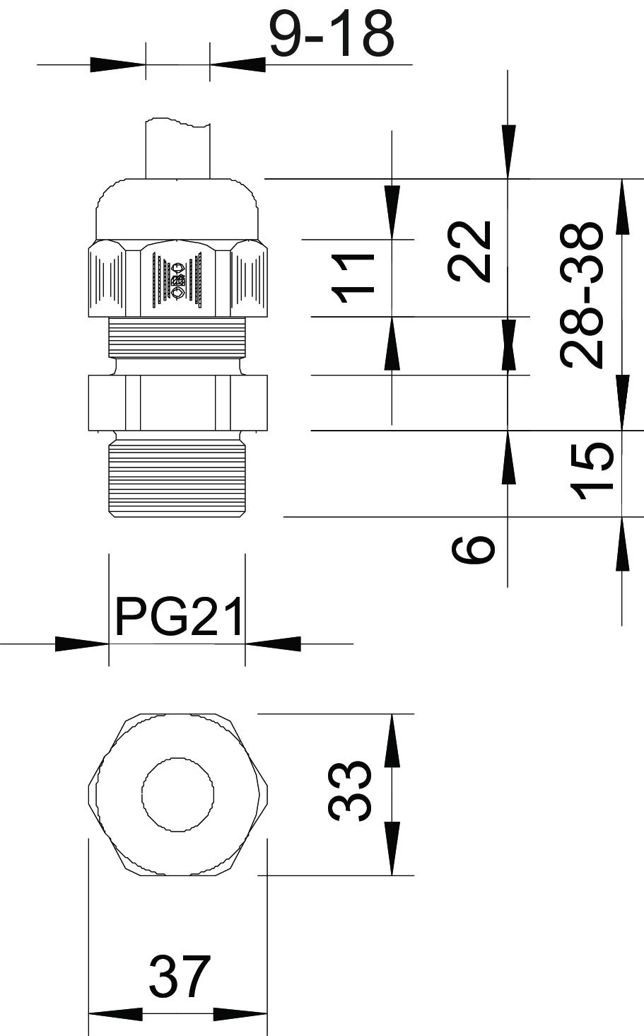 Bend protection no CO2 Footprint (GWP) Cradle-to-Gate 0,1134 kg CO2e / 1 Piece Colour Light grey; RAL 7035 Dimension PG21 Dimension E 37,5 mm Dimension L max. 38 mm Dimension L min. 28 mm Dimension L1 15 mm Dimension L2 6 mm Dimension L3 22 mm explosion-proof no Fibre-glass reinforced no Flat cable gland no For Ex zone Without For Ex zone dust Without For Ex zone gas Without Halogen-free yes Hexagonal corner dimension 37,5 mm Impact-resistant no Material Polyamide Nominal thread size 21 Permitted temperature range, max. 65 °C Permitted temperature range, min. -20 °C Protection rating IP68 Sealing area D, max. 18 mm Sealing area D, min. 9 mm Sealing insert, multiple no Splittable gland no Strain relief option yes Thread Pg 21 Thread increase 1,5 mm Thread length 15 mm Thread type PG Type of seal Sealing ring Unstable torque 5 Nm Version for Straight WAF 33 With locknut no - All types