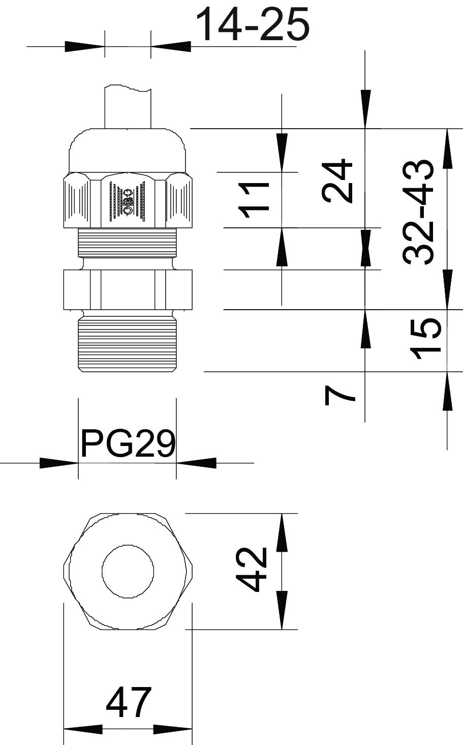 Bend protection no CO2 Footprint (GWP) Cradle-to-Gate 0,1809 kg CO2e / 1 Piece Colour Light grey; RAL 7035 Dimension PG29 Dimension E 47,5 mm Dimension L max. 43 mm Dimension L min. 32 mm Dimension L1 15 mm Dimension L2 7 mm Dimension L3 24,5 mm explosion-proof no Fibre-glass reinforced no Flat cable gland no For Ex zone Without For Ex zone dust Without For Ex zone gas Without Halogen-free yes Hexagonal corner dimension 47,5 mm Impact-resistant no Material Polyamide Nominal thread size 29 Permitted temperature range, max. 65 °C Permitted temperature range, min. -20 °C Protection rating IP68 Sealing area D, max. 25 mm Sealing area D, min. 14 mm Sealing insert, multiple no Splittable gland no Strain relief option yes Thread Pg 29 Thread increase 1,5 mm Thread length 15 mm Thread type PG Type of seal Sealing ring Unstable torque 5 Nm Version for Straight WAF 42 With locknut no - All types