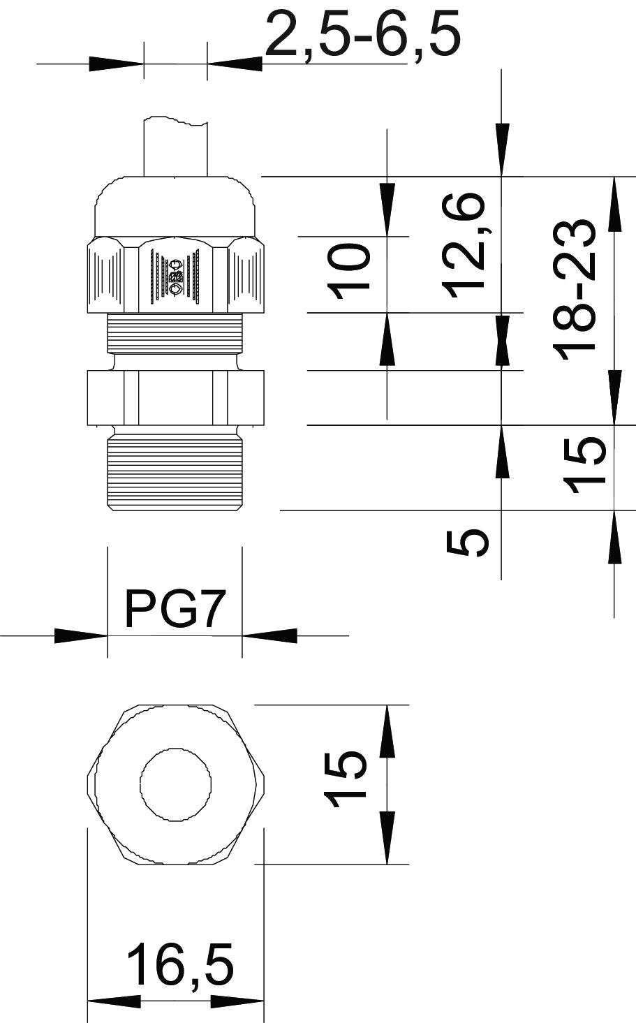 Bend protection no CO2 Footprint (GWP) Cradle-to-Gate 0,0307 kg CO2e / 1 Piece Colour Light grey; RAL 7035 Dimension PG7 Dimension E 16,5 mm Dimension L max. 23 mm Dimension L min. 18 mm Dimension L1 15 mm Dimension L2 5 mm Dimension L3 12,6 mm explosion-proof no Fibre-glass reinforced no Flat cable gland no For Ex zone Without For Ex zone dust Without For Ex zone gas Without Halogen-free yes Hexagonal corner dimension 16,5 mm Impact-resistant no Material Polyamide Nominal thread size 7 Permitted temperature range, max. 65 °C Permitted temperature range, min. -20 °C Protection rating IP68 Sealing area D, max. 6,5 mm Sealing area D, min. 2,5 mm Sealing insert, multiple no Splittable gland no Strain relief option yes Thread Pg 7 Thread increase 1,5 mm Thread length 15 mm Thread type PG Type of seal Sealing ring Unstable torque 1,67 Nm Version for Straight WAF 15 With locknut no - All types
