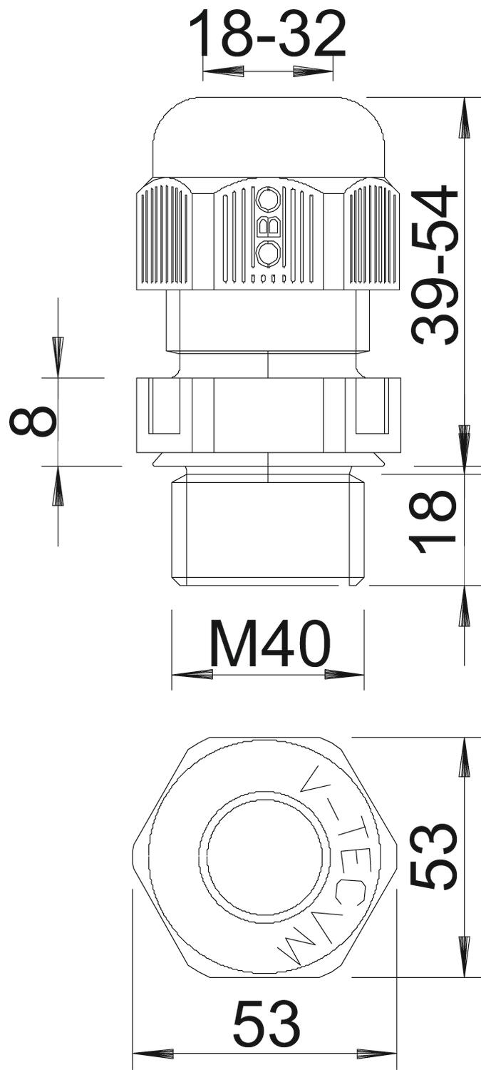 Bend protection no CO2 Footprint (GWP) Cradle-to-Gate 0,3942 kg CO2e / 1 Piece Colour Light grey; RAL 7035 Dimension M40 Dimension L max. 54 mm Dimension L min. 39 mm Dimension L1 18 mm Dimension L2 8 mm Dimension L3 31 mm Dimension L4 18 mm explosion-proof no Fibre-glass reinforced no Flat cable gland no For Ex zone Without Halogen-free yes Impact-resistant no Material Polyamide Permitted temperature range, max. 65 °C Permitted temperature range, min. -20 °C Protection rating IP68 Sealing area D, max. 32 mm Sealing area D, min. 18 mm Sealing insert, multiple no Strain relief option yes Thread M40 x 1,5 Thread type Metric Type of seal Sealing ring Version for Straight WAF 53 With locknut no - All types