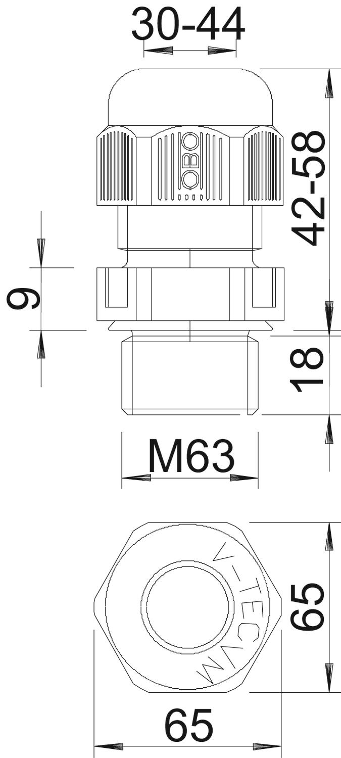 Bend protection no CO2 Footprint (GWP) Cradle-to-Gate 0,4712 kg CO2e / 1 Piece Colour Light grey; RAL 7035 Dimension M63 Dimension L max. 58 mm Dimension L min. 42 mm Dimension L1 18 mm Dimension L2 9 mm Dimension L3 33 mm Dimension L4 19,5 mm explosion-proof no Fibre-glass reinforced no Flat cable gland no For Ex zone Without Halogen-free yes Impact-resistant no Material Polyamide Permitted temperature range, max. 65 °C Permitted temperature range, min. -20 °C Protection rating IP68 Sealing area D, max. 44 mm Sealing area D, min. 30 mm Sealing insert, multiple no Strain relief option yes Thread M63 x 1,5 Thread type Metric Type of seal Sealing ring Version for Straight WAF 65 With locknut no - All types