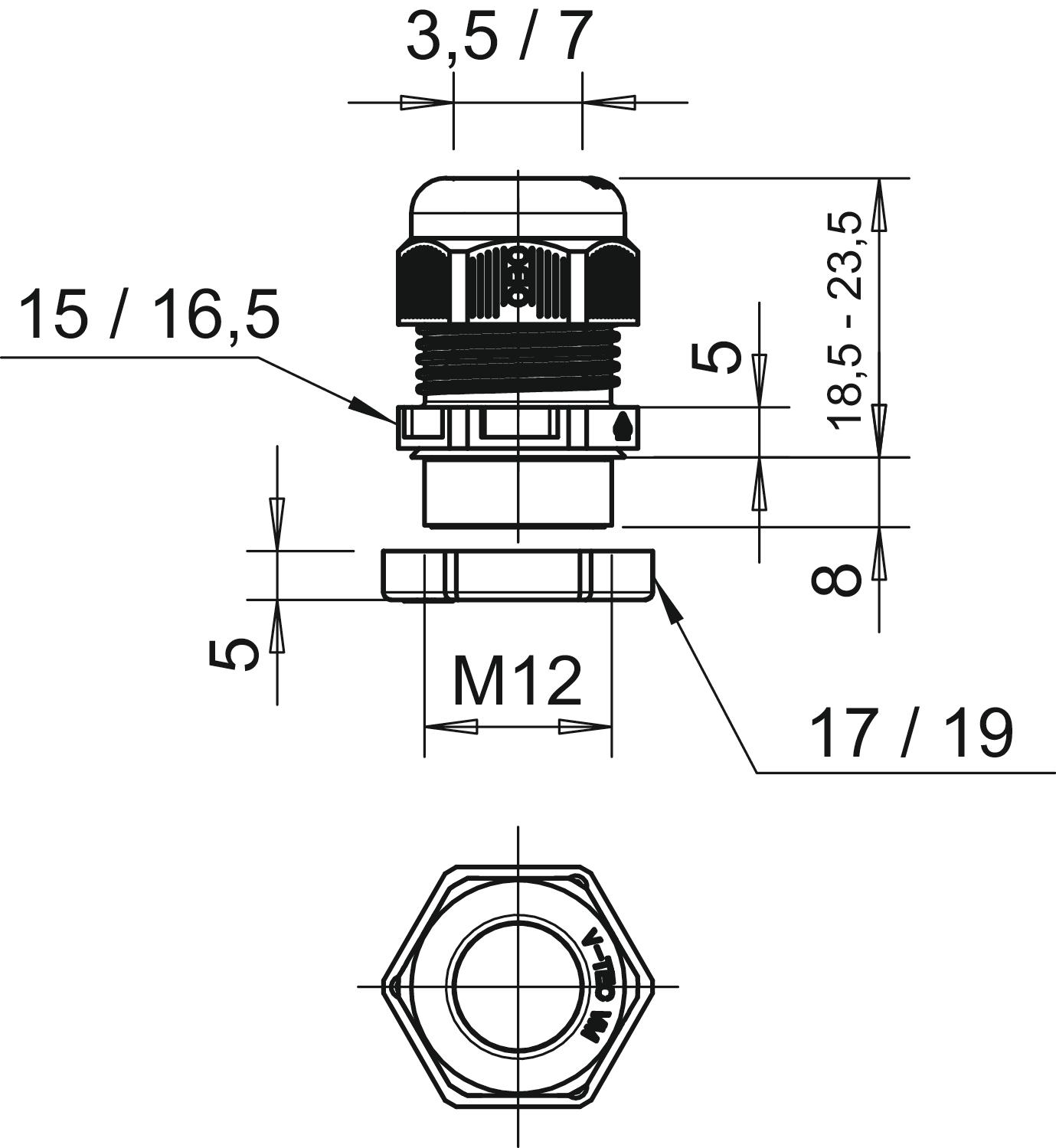 Bend protection no CO2 Footprint (GWP) Cradle-to-Gate 0,0255 kg CO2e / 1 Piece Colour Light grey; RAL 7035 Dimension M12 Dimension E1 (mm) 16,5 mm Dimension E2 19 mm Dimension L max. 23,5 mm Dimension L min. 18,5 mm Dimension L1 8 mm Dimension L2 5 mm Dimension L3 5 mm explosion-proof no Fibre-glass reinforced no Flame-resistant acc. to VDE 0471/DIN 695 Part 2-1, test temperature 650°C Flat cable gland no For Ex zone Without For Ex zone dust Without For Ex zone gas Without Halogen-free yes Impact-resistant no Material Polyamide Nominal thread size 12 Permitted temperature range, max. 65 °C Permitted temperature range, min. -20 °C Protection rating IP68 Sealing area D, max. 7 mm Sealing area D, min. 3,5 mm Sealing insert, multiple no Splittable gland no Strain relief option yes Thread M12 x 1,5 Thread increase 1,5 mm Thread length 8 mm Thread type Metric Type of seal Sealing ring Unstable torque 2 Nm Version for Straight WAF 1 15 mm WAF 2 17 mm With locknut no - All types