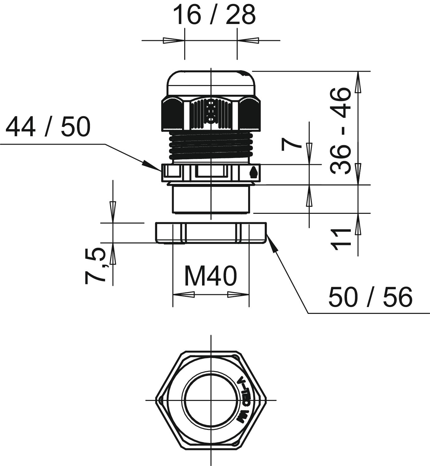 Bend protection no CO2 Footprint (GWP) Cradle-to-Gate 0,204 kg CO2e / 1 Piece Colour Light grey; RAL 7035 Dimension M40 Dimension E1 (mm) 50 mm Dimension E2 56 mm Dimension L max. 46 mm Dimension L min. 36 mm Dimension L1 11 mm Dimension L2 7 mm Dimension L3 7,5 mm explosion-proof no Fibre-glass reinforced no Flame-resistant acc. to VDE 0471/DIN 695 Part 2-1, test temperature 650°C Flat cable gland no For Ex zone Without For Ex zone dust Without For Ex zone gas Without Halogen-free yes Impact-resistant no Material Polyamide Nominal thread size 40 Permitted temperature range, max. 65 °C Permitted temperature range, min. -20 °C Protection rating IP68 Sealing area D, max. 28 mm Sealing area D, min. 16 mm Sealing insert, multiple no Splittable gland no Strain relief option yes Thread M40 x 1,5 Thread increase 1,5 mm Thread length 11 mm Thread type Metric Type of seal Sealing ring Unstable torque 10 Nm Version for Straight WAF 1 44 mm WAF 2 50 mm With locknut no - All types