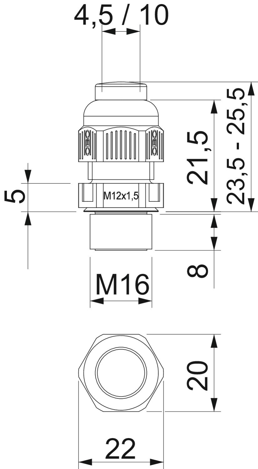 Bend protection no CO2 Footprint (GWP) Cradle-to-Gate 0,0367 kg CO2e / 1 Piece Colour Light grey; RAL 7035 Dimension M16 Dimension E 22 mm Dimension L max. 23,5 mm Dimension L min. 25,5 mm Dimension L1 8 mm Dimension L2 5 mm Dimension L3 21,5 mm explosion-proof no Fibre-glass reinforced no Flame-resistant acc. to VDE 0471/DIN 695 Part 2-1, test temperature 650°C Flat cable gland no For Ex zone Without For Ex zone dust Without For Ex zone gas Without Halogen-free yes Height 22 mm Hexagonal corner dimension 22 mm Impact-resistant no Length 25,5 mm Material Polyamide Nominal thread size 16 Permitted temperature range, max. 65 °C Permitted temperature range, min. -20 °C Protection rating IP68 Sealing area D, max. 10 mm Sealing area D, min. 4,5 mm Sealing insert, multiple no Splittable gland no Strain relief option yes Thread M16 x 1,5 Thread increase 1,5 mm Thread length 8 mm Thread type Metric Type of seal Sealing ring Version for Straight WAF 20 WAF 1 20 mm Width 20 mm With locknut no - All types