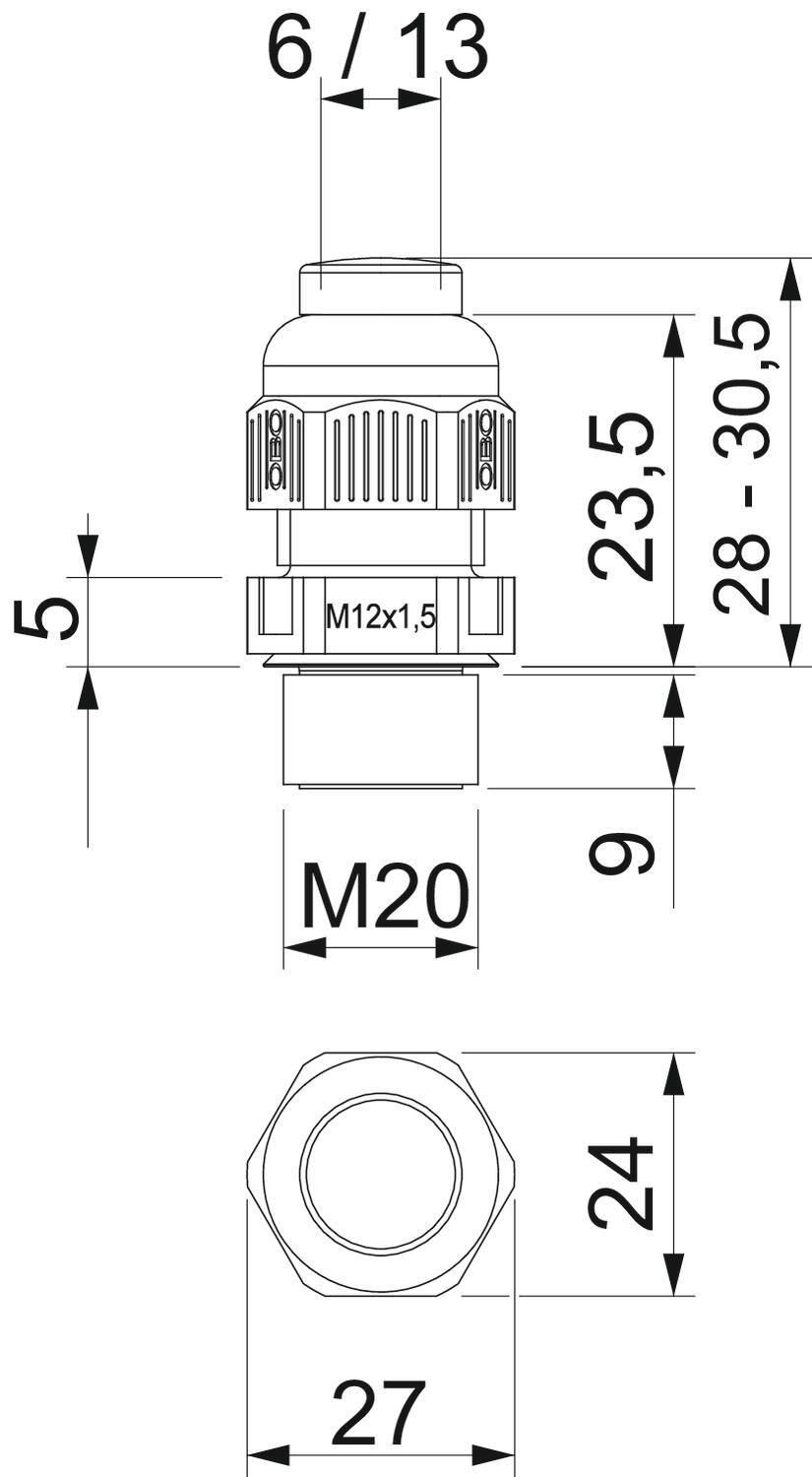 Bend protection no CO2 Footprint (GWP) Cradle-to-Gate 0,0495 kg CO2e / 1 Piece Colour Light grey; RAL 7035 Dimension M20 Dimension E 27 mm Dimension L max. 30,5 mm Dimension L min. 28 mm Dimension L1 9 mm Dimension L2 5 mm Dimension L3 23,5 mm explosion-proof no Fibre-glass reinforced no Flame-resistant acc. to VDE 0471/DIN 695 Part 2-1, test temperature 650°C Flat cable gland no For Ex zone Without For Ex zone dust Without For Ex zone gas Without Halogen-free yes Height 27 mm Hexagonal corner dimension 27 mm Impact-resistant no Length 28 mm Material Polyamide Nominal thread size 20 Permitted temperature range, max. 65 °C Permitted temperature range, min. -20 °C Protection rating IP68 Sealing area D, max. 13 mm Sealing area D, min. 6 mm Sealing insert, multiple no Splittable gland no Strain relief option yes Thread M20 x 1,5 Thread increase 1,5 mm Thread length 10 mm Thread type Metric Type of seal Sealing ring Unstable torque 3,8 Nm Version for Straight WAF 24 WAF 1 24 mm Width 24 mm With locknut no - All types