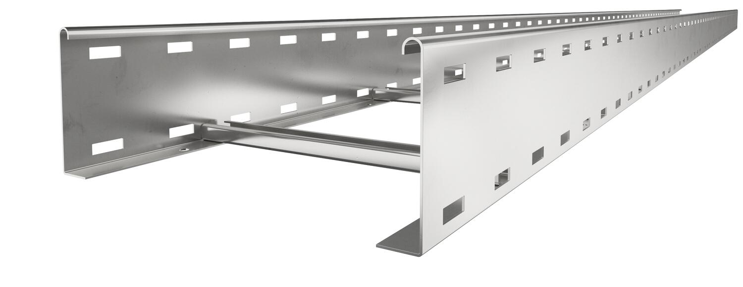 Product descriptionCable ladder with perforated side rail of side height 110 mm with riveted C profile rungs, open in an upwards direction.