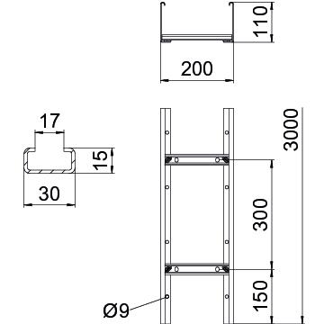 Product descriptionCable ladder with 110 mm side height with welded C30 profile rungs which are open in an upwards direction. Rolled side rail for reinforcement and as edge protection. Fastening to the bracket takes place using clamps, type LKS 40. The slot dimension of the frame is 16.5 mm and the appropriate clamp clip is type 2056.