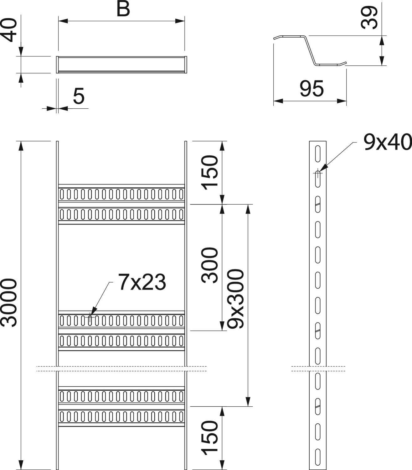 CO2 Footprint (GWP) Cradle-to-Gate 7,8595 kg CO2e / 1 Meter Colour zinc Dimension 40x110x3000 Dimension 40x100 Dimension B 110 mm Fastening of rung Welded Height 40 mm Length 3000 mm Maintain electrical functions no Material Steel Rail thickness 5 mm Rung distance 300 mm Rustproof steel, pickled no Side perforation yes Side rail version Flat profile Support spacing 1.5 m 2,8 kN/m Support spacing 2.0 m 1,75 kN/m Support spacing 2.5 m 1 kN/m Support spacing 3.0 m 0,6 kN/m Surface Hot-dip galvanised Version of the rungs Profile perforated Wide-span version no Width 100 mm Technical data