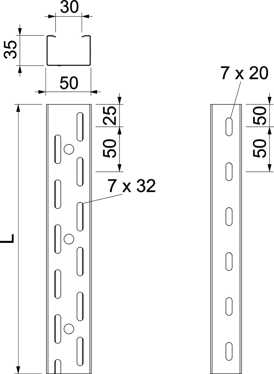 Base perforation 7 x 32 CO2 Footprint (GWP) Cradle-to-Gate 1,9353 kg CO2e / 1 Meter Colour zinc Connector version Without connectors Dimension 35x50 Dimension 35x50x3000 Dimension L 3000 mm Height 35 mm Length 3000 mm Load test type according to IEC 61537 Type II Maintain electrical functions no Material Steel Mounting perforation in base yes NATO hole pattern no Plate thickness 0,75 mm Rustproof steel, pickled no Side perforation yes Support spacing 1.0 m 1,2 kN/m Support spacing 1.5 m 0,5 kN/m Support spacing 2.0 m 0,3 kN/m Support spacing 2.5 m 0,1 kN/m Support spacing 3.0 m 0,05 kN/m Surface Hot-dip galvanised Type of connector, cable support system Screwed Usable cross-section 1600 mm² Usable cross-section 16 cm² Wide-span version no Width 50 mm With cover no Technical data