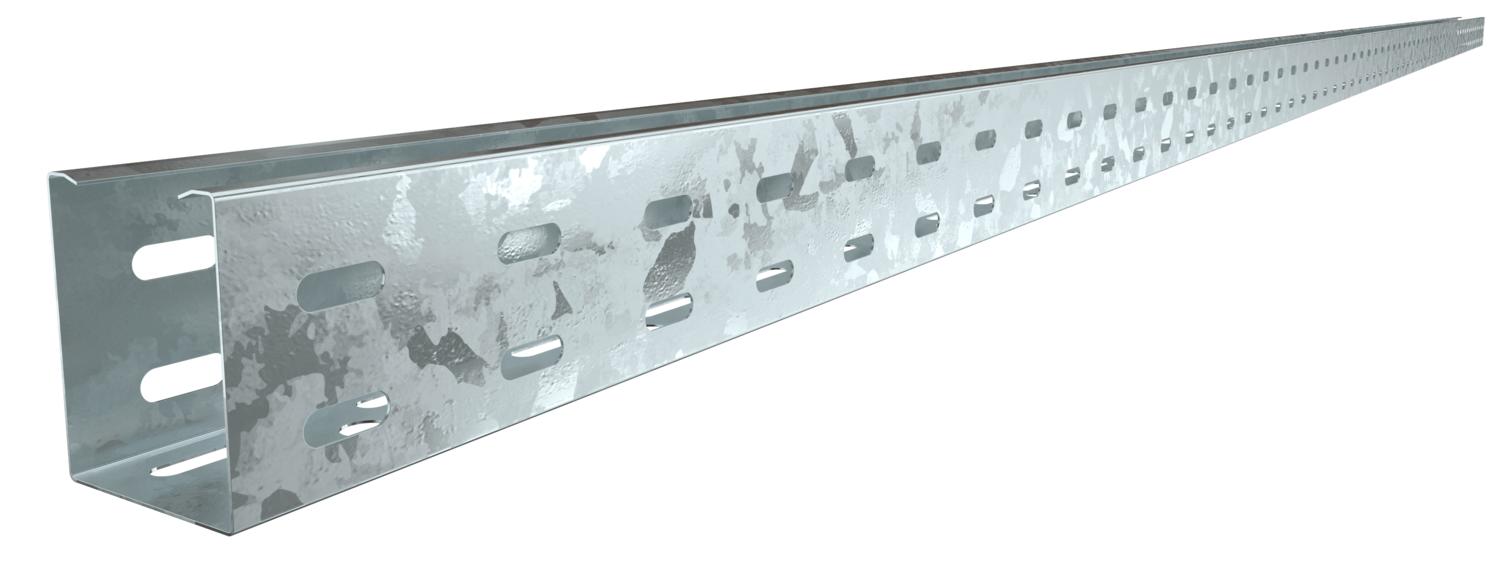 Cable tray with continuous bottom and side perforation as well as central holes (Ø11 mm) in the base for additional fastenings.