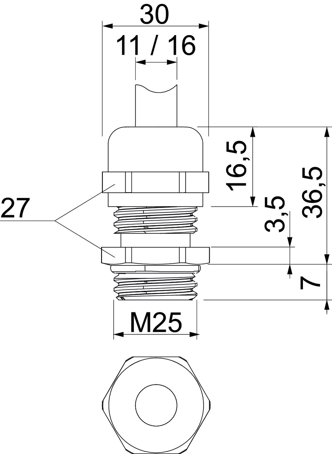Bend protection no CO2 Footprint (GWP) Cradle-to-Gate 0,1329 kg CO2e / 1 Piece Dimension M25 Dimension E 30 mm Dimension L max. 36,5 mm Dimension L1 7 mm Dimension L2 3,5 mm Dimension L3 16,5 mm Fibre-glass reinforced no Flat cable gland no For Ex zone Without Halogen-free no Impact-resistant no Material Brass Permitted temperature range, max. 100 °C Permitted temperature range, min. -20 °C Protection rating IP68 Sealing area D, max. 16 mm Sealing area D, min. 11 mm Sealing insert, multiple no Strain relief option yes Surface Nickel-plated Thread M25 x 1,5 Thread length 7 mm Thread type Metric Type of seal Sealing ring Unstable torque 6,7 Nm Version for Straight WAF 27 With locknut no - All types