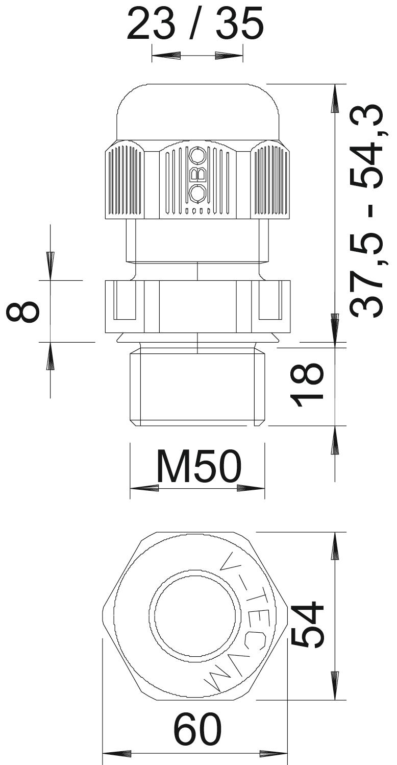 Bend protection no CO2 Footprint (GWP) Cradle-to-Gate 0,6217 kg CO2e / 1 Piece Dimension M50 Dimension E 60 mm Dimension L max. 38,5 mm Dimension L1 14 mm Dimension L2 4,5 mm Dimension L3 25 mm explosion-proof no Fibre-glass reinforced no Flat cable gland no For Ex zone Without Halogen-free no Impact-resistant no Material Brass Permitted temperature range, max. 100 °C Permitted temperature range, min. -20 °C Protection rating IP68 Sealing area D, max. 35 mm Sealing area D, min. 24 mm Sealing insert, multiple no Strain relief option yes Surface Nickel-plated Thread M50 x 1,5 Thread length 14 mm Thread type Metric Type of seal Sealing ring Version for Straight WAF 55 With locknut no - All types