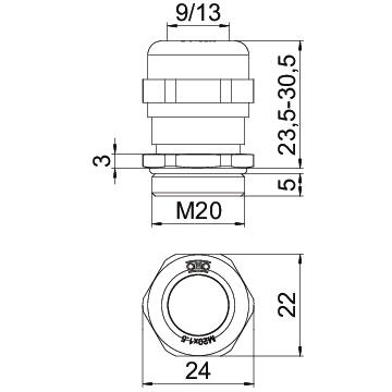 Bend protection no CO2 Footprint (GWP) Cradle-to-Gate 0,0806 kg CO2e / 1 Piece Dimension M20 Dimension E 24 mm Dimension L max. 27 mm Dimension L1 6 mm Dimension L2 3,5 mm Dimension L3 16,5 mm explosion-proof no Fibre-glass reinforced no Flat cable gland no For Ex zone Without Halogen-free no Hexagonal corner dimension 24 mm Impact-resistant no Material Brass Permitted temperature range, max. 100 °C Permitted temperature range, min. -20 °C Protection rating IP68 Sealing area D, max. 13 mm Sealing area D, min. 9 mm Sealing insert, multiple no Strain relief option yes Surface Nickel-plated Thread M20 x 1,5 Thread length 6 mm Thread type Metric Type of seal Sealing ring Unstable torque 3,5 Nm Version for Straight WAF 22 With locknut no - All types