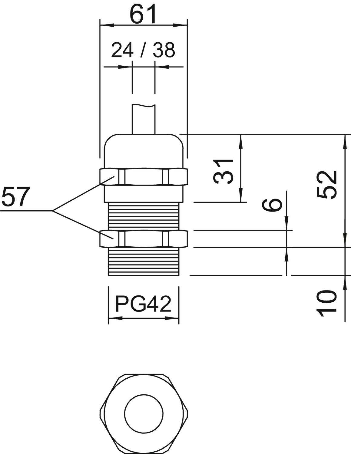 Bend protection no CO2 Footprint (GWP) Cradle-to-Gate 0,8629 kg CO2e / 1 Piece Dimension PG42 Dimension E 61 mm Dimension L max. 52 mm Dimension L1 10 mm Dimension L2 6 mm Dimension L3 31 mm explosion-proof no Fibre-glass reinforced no Flat cable gland no For Ex zone Without For Ex zone dust Without For Ex zone gas Without Halogen-free no Impact-resistant no Material Brass Nominal thread size 42 Permitted temperature range, max. 100 °C Permitted temperature range, min. -20 °C Protection rating IP68 Sealing area D, max. 38 mm Sealing area D, min. 24 mm Sealing insert, multiple no Splittable gland no Strain relief option yes Surface Nickel-plated Thread Pg 42 Thread length 10 mm Thread type PG Type of seal Sealing ring Version for Straight WAF 57 With locknut no - All types