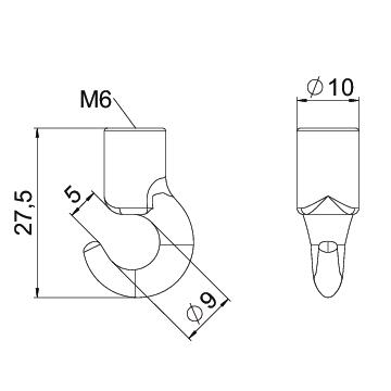 Breaking load 0,65 kN CO2 Footprint (GWP) Cradle-to-Gate 0,0245 kg CO2e / 1 Piece Diameter 10 mm Dimension M6 hook diameter 9 mm Length 27,5 mm Material Steel Surface Electrogalvanized Thread M6 Thread length 9 mm - All types