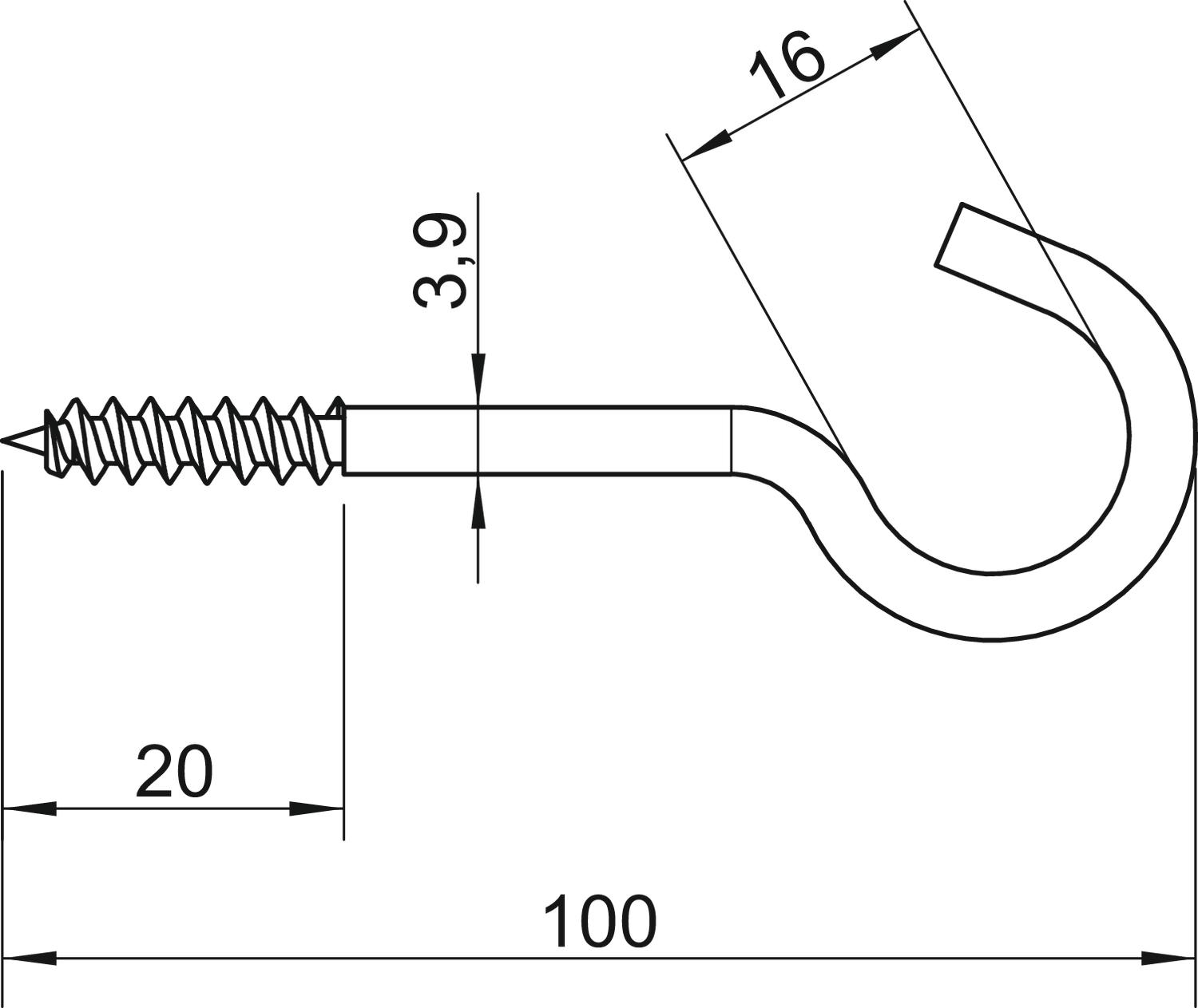 Breaking load 0,15 kN Dimension 3,9x100mm Dimension L 100 mm Dimension L1 20 mm hook diameter 16 mm Length 100 mm Material Steel Material diameter 3,9 mm Plastic-covered no Surface Electrogalvanized Thread length 20 mm - All types