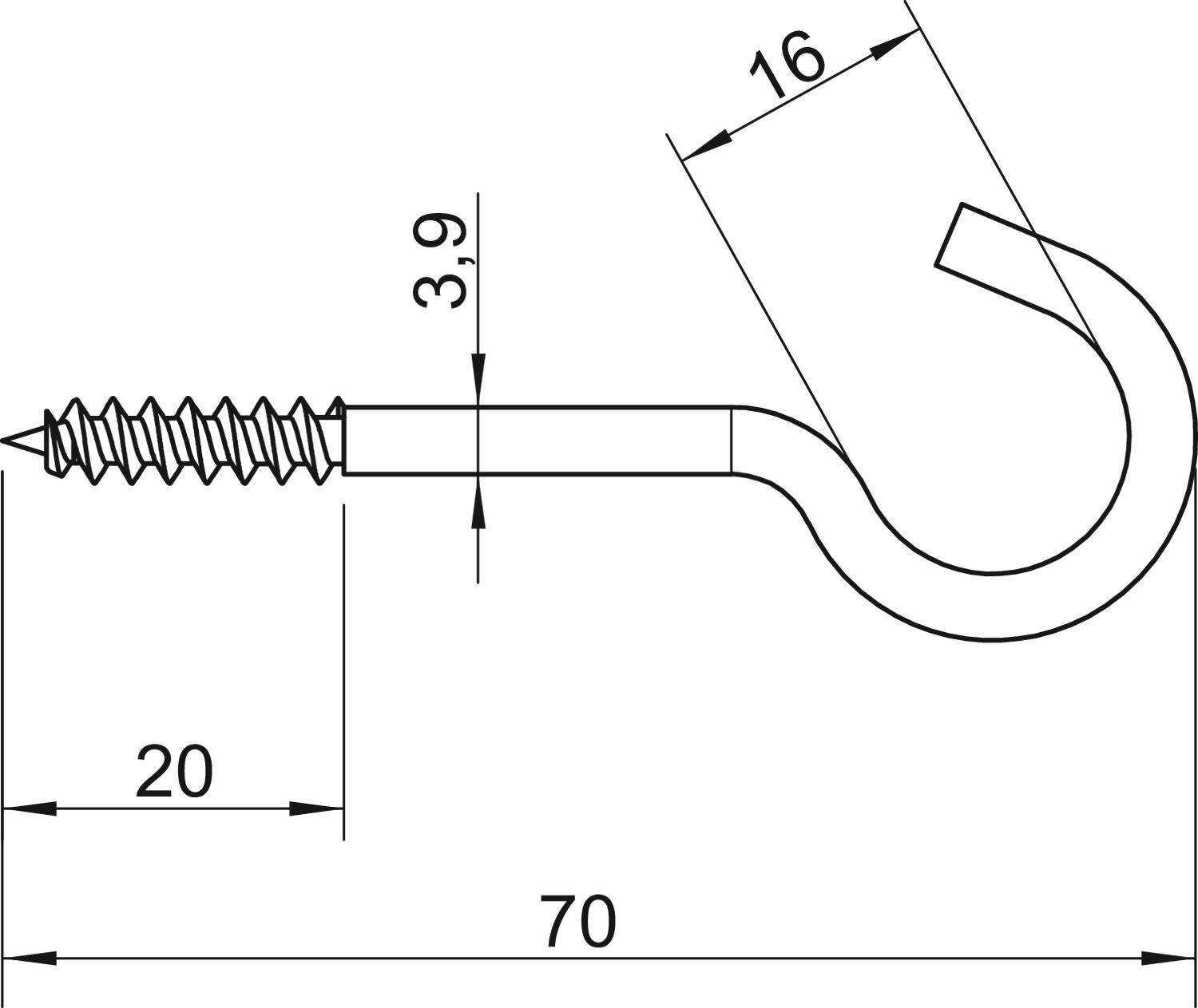 Breaking load 0,15 kN Dimension 3,9x70mm Dimension L 70 mm Dimension L1 20 mm hook diameter 16 mm Length 70 mm Material Steel Material diameter 3,9 mm Plastic-covered no Surface Electrogalvanized Thread length 20 mm - All types