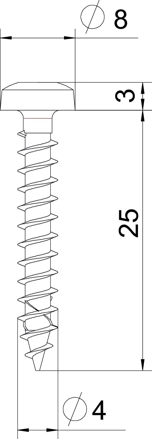 Dimension 4x25mm Dimension D 4 mm Dimension L 25 mm Drive size TX 20 Hardened no Head diameter 8 mm Head shape Panhead Length 25 mm Material Stainless steel Screw system Torx Surface Bright, treated Two-compartment no - All types
