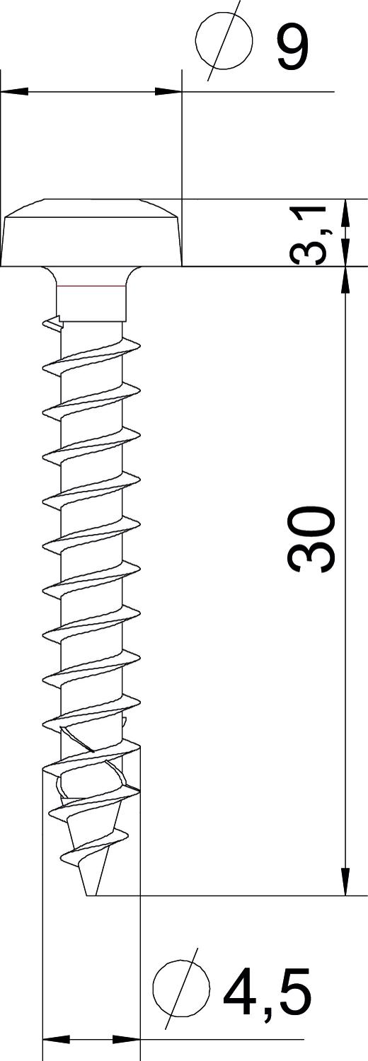 Dimension 4,5x30mm Dimension D 4,5 mm Dimension L 30 mm Drive size TX 20 Hardened no Head diameter 9 mm Head shape Panhead Length 30 mm Material Stainless steel Screw system Torx Surface Bright, treated Two-compartment no - All types