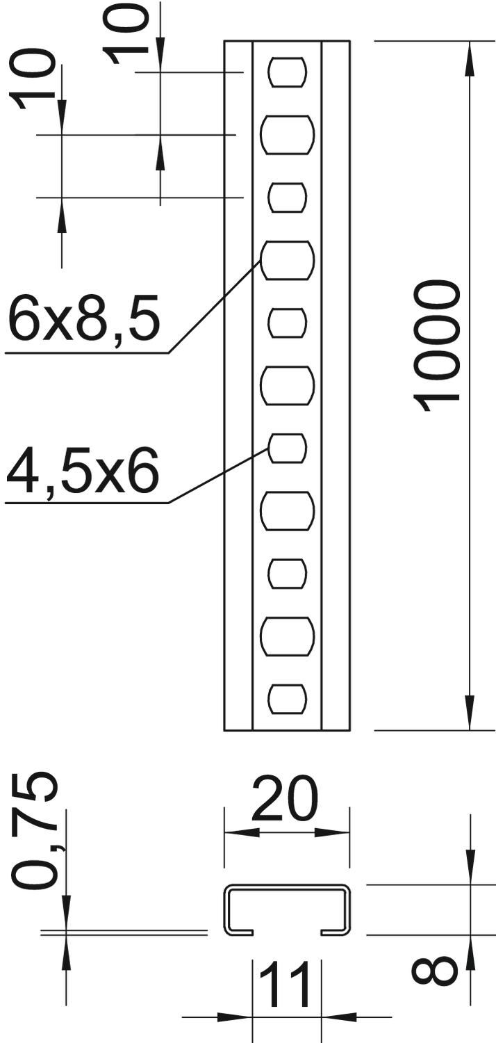 Breakable no Bundle 10 m CO2 Footprint (GWP) Cradle-to-Gate 0,5401 kg CO2e / 1 Meter Dimension 1000x20x8 Dimension L 1000 mm Drill hole spacing, centre 10 mm Height 8 mm Length 1000 mm Maintain electrical functions no Material Steel Material thickness 0,75 mm Profile shape C profile Slot width 11 mm Static value A 0,24 cm² Static value ly 0,02 cm⁴ Static value lz 0,17 cm⁴ Static value Wy 0,05 cm³ Static value Wz 0,17 cm³ Surface Strip galvanized Type of perforation Perforated back Version for Single profile Width 20 mm With perforation yes With toothing no - All types