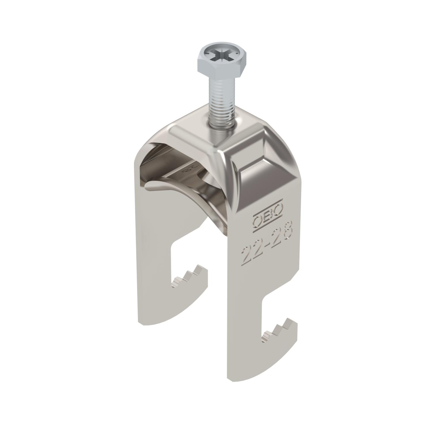 Product descriptionClamp clip with F-foot, metal pressure sleeve with rounded edges to protect the cable. For vertical and horizontal mounting of 1 single cable on flat bars. With 1-start screw thread on pressure sleeve, universal hexagonal screw head WAF10, with slot and cross recess. Suitable for assembly indoors and outdoors. We recommend the use of a counter-sleeve.
