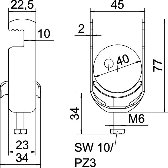 Clamping range D, max. 40 mm Clamping range D, min. 34 mm CO2 Footprint (GWP) Cradle-to-Gate 0,5253 kg CO2e / 1 Piece Dimension 34-40mm Dimension A 22,5 mm Dimension B 45 mm Dimension C 33 mm Dimension G (mm) M6 Dimension H 77 mm Dimension L 34 mm Dimension t 2 mm For pipe diameter, max. 40 mm For pipe diameter, min. 34 mm Halogen-free yes Height 77 mm Length 22,5 mm Length of external dimensions 33 mm Material Stainless steel 1.4301 Material addition Rustproof steel Material of trough Rustproof steel Material quality of trough Stainless steel 304 (1.4301) Max. Tightening torque 3 Nm Mounting type Flat profile Number of cables/pipes 1 Plate thickness 2 mm Slot width 10 mm Surface Bright, treated Surface addition Untreated Thread M6 Width 45 mm With counter-trough no With metal trough yes - All types
