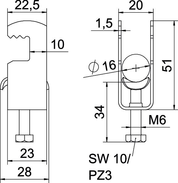 Clamping range D, max. 16 mm Clamping range D, min. 12 mm CO2 Footprint (GWP) Cradle-to-Gate 0,1034 kg CO2e / 1 Piece Dimension 12-16mm Dimension A 22,5 mm Dimension B 20 mm Dimension C 28 mm Dimension G (mm) M6 Dimension H 51 mm Dimension L 34 mm Dimension t 1,5 mm For pipe diameter, max. 16 mm For pipe diameter, min. 12 mm Halogen-free yes Height 51 mm Length 22,5 mm Length of external dimensions 28 mm Material Steel Material addition Steel Material of trough Steel Max. Tightening torque 3 Nm Mounting type Flat profile Number of cables/pipes 1 Plate thickness 1,5 mm Slot width 10 mm Surface Hot-dip galvanised Surface addition hot galvanised Thread M6 Width 20 mm With counter-trough no With metal trough yes - All types
